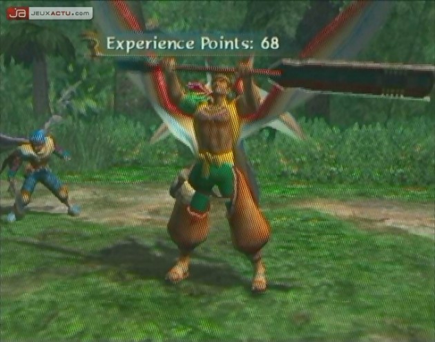 Vous l’aurez compris, on n’est pas au bout de nos surprises lorsqu’on joue à Baten Kaitos, d’autant plus qu’afin d’éviter les temps morts, notamment en phase défensive, il faut sélectionner les Magnus juste avant l’attaque ennemie en une fraction de seconde. Il convient donc d’être constamment attentif et sur le qui-vive ! Si vous pensiez vous retrouvez face-à-face avec un clone de Yu-Gi-Oh au gameplay soporifique, passez votre chemin. A la fin de chaque combat, vous gagnerez, comme dans tous les jeux de rôle, de l’expérience. Cependant, l’évolution n’est pas immédiate. Il faudra vous rendre à l’Eglise via un point de sauvegarde pour progresser. Lorsque vous gagnez des niveaux, vos points de vie et vos compétences au combat augmentent. Vous pouvez également grimper en Classe ce qui vous octroiera un deck plus important et la possibilité de choisir plus de Magnus pendant les duels. A cette originalité de jeu, il faut rajouter une réalisation tout bonnement spectaculaire. Même si la modélisation des personnages est assez quelconque, voire dépassée, les décors sont d’une beauté à pleurer et on s’émerveille à chaque voyage. Et lorsque ce ne sont pas les paysages qui nous bluffent, ce sont les scènes cinématiques qui nous scotchent à notre pad. Il en est tout autant pour les mélodies enchanteresses signées Motoi Sakuraba qui bercent l’exploration et qui savent être très rock lors des combats. Un petit bémol pourrait être formulé au sujet du traitement des voix, elles hurlent perpétuellement le nom des attaques durant les combats, ce qui devient rapidement très agaçant ! Fort heureusement, Namco a pensé à tout avec la possibilité de les désactiver en passant par le menu des options. Une nouvelle fois, l’éditeur a préféré laissé les voix en anglais et le résultat est plutôt payant car bon nombre de personnages possèdent leurs voix propres. Si vous vous inquiétez au sujet de la durée de vie du soft, rassurez-vous, entre la trame principale et la foultitude de mini quêtes, le jeu n’est pas prêt de prendre la poussière.