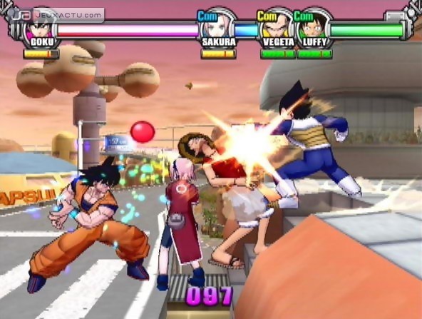 Pouvoir réunir Dragon Ball, One Piece et Naruto pour une confrontation au sommet, il n’y a que dans le jeu vidéo que cela est possible. Et puisque la mode est au cross-over, Bandai Namco Games a fait appel au tandem Tomy Takara et au studio 8ing pour mettre en œuvre ce simili-Smash Bros. sur GameCube et PlayStation 2, histoire de s’assurer un carton pour l’été. Si l’idée de base est on ne peut plus alléchante, le résultat est à la fois mi-figue mi-raisin.