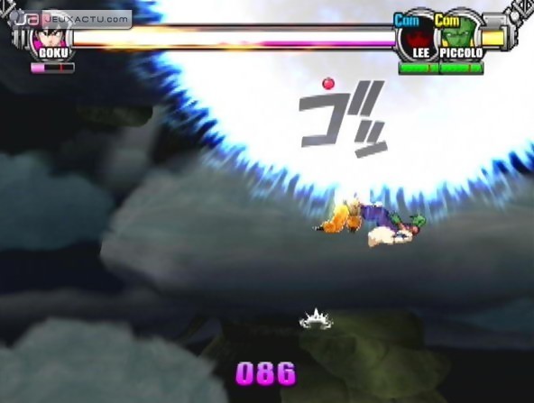 Avec un panel de stars aussi alléchant, il semblait évident que 8ing allait nous préparer une cinématique d’intro des plus claquantes. Que nenni ! Non seulement, le studio s’est ramassé sur la mise en scène mais en sus a opté pour un design assez fâcheux et en totale désharmonie avec le style graphique de chacune des licences. Quant à la musique qui accompagne les images, n’en parlons pas, c’est d’un mauvais goût surprenant, si bien qu’on se pose des questions sur ce qui va arriver par la suite. Dieu soit loué, la modélisation des personnages dans le jeu n’est pas du même acabit. Certes, on attendait mieux de la part d’un studio tel que 8ing mais l’ensemble reste suffisamment cohérent et fidèle pour ne pas se sentir frustré. Au menu des festivités, on retrouve donc les personnages les plus emblématiques de chaque série. Goku, Vegeta, Gohan et Piccolo pour DBZ ; Luffy, Zoro, Chopper et Sanji pour One Piece ; Naruto, Sasuke, Kakashi et Sakura pour Naruto. Si l’on sait compter, ce sont donc 12 personnages qui sont accessibles d’entrée de jeu. Cela paraît évidemment bien peu comparé à un Super Smash Bros. Melee mais que l’on se rassure, il existe d’autres personnages à débloquer au cours du jeu. Trunks, Frieza, Cell, Buu, Usopp, Nami, Rock Lee et Gaara, tels sont les 8 autres protagonistes qu’il sera possible d’incarner une fois qu’on sera en face de cette satanée machine à sous. Et oui, aussi tordu que cela puisse paraître, c’est en activant le levier d’une machine à sous que l’on peut débloquer les divers bonus du jeu. Mais avant de s’attarder à cette partie, focalisons-nous sur le gameplay, un poil pompé sur Super Smash Bros. Melee.