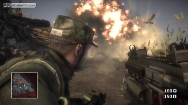 Cependant, n’attendez pas grand chose de ces derniers. Bien qu’ils soient armés jusqu’aux dents, c’est vous qui vous coltinerez tout le sale boulot. Qu’il s’agisse de faire exploser des réserves d’armes, ou placer du C4 sur certains véhicules, le trio accompagnateur ne bronchera pas. Il fera surtout acte de présence lorsque les ennemis pointeront le bout de leur museau, sans pour autant faire mouche. Pire encore, les adversaires auront la fâcheuse tendance à se focaliser sur vous, plutôt qu’à éliminer les autres gusses, invincibles de surcroît. A vous donc de faire le ménage en pleine Europe de l’Est. Et pour y parvenir, Digital Illusions CE n’a pas lésiné sur les moyens avec un arsenal riche en pétoires et en explosifs. Et c’est bien évidemment ce dernier équipement qui intéressera tout un chacun. Outre le fait de proposer un véritable mode scénarisé, Battlefield : Bad Company s’est offert les joies de la destruction massive, un peu à l’instar d’un Stranglehold, mais sur une échelle beaucoup plus importante. Rien ou presque ne résistera à votre passage. Clôtures, forêts, cabanes, routes, ponts, maisons, véhicules ou même des villages entiers, l’interaction avec les décors est poussée à son paroxysme grâce à une utilisation intelligente des explosifs. Chaque arme ramassée est accompagnée d’une option lance-grenades ou d’une grenade tout court, ce qui fait que vous n’êtes jamais à court d’explosifs durant les fusillades. De plus, certaines cartes proposent d’assouvir sa soif de destruction grâce à du C4 ou des lance-roquettes, quand ces derniers n’offrent pas des tourelles ou des canons antiaériens. Ainsi équipé, vous allez pouvoir débusquer le moindre ennemi, même si ce dernier est retranché en haut d’une tour inaccessible. Il suffit de bien viser pour détruire tout un pan de mur, et ainsi mettre à jour sa cachette. De ce fait, même le plus planqué des soldats a toutes les chances de se prendre une balle en pleine tête. Et ce qui est valable pour les ennemis est également valable pour vous. En face, vous aurez à affronter une armée entière de soldats qui fera sauter en moins de temps qu’il n’en faut votre abri de fortune. Vous serez donc obligé de changer régulièrement de poste de tir pour ne pas vous retrouver au beau milieu d’un champ de ruines, totalement à découvert. Si cette technique de "j’explose tout" permet à Battlefield : Bad Company de proposer des combats dynamiques et peu linéaires, elle a également ses limites. Impossible de réduire en un tas de cendres une maison à l’image de Mercenaries. Elle restera debout, en piteux état, même si vous y mettez toute la bonne volonté du monde. Autre souci : les munitions. Les balles n’ont quasiment aucun effet sur le décor, en dehors des barils d’essence qui pullulent à tout va. A titre d’exemple, il faut décharger totalement son arme pour venir à bout d’une barrière en bois, alors qu’un coup de couteau servira à faire sauter une porte… Etrange. Il en va de même pour les ennemis qui semblent posséder trois épaisseurs de gilets pare-balles. A moins d’un headshot, là aussi il faudra gaspiller quelques bastos. Voilà pourquoi on se rue dès que possible sur les moindres munitions, d’autant plus que les cartouchières sont assez légères. Autre petit désagrément du jeu : lorsqu’on récupère une arme, on change forcément de type d’explosif. Pourquoi n’est-il pas possible de conserver des grenades tout en récupérant une mitrailleuse montée sur un lance-grenades ? Mystère. Tout aussi bizarre, les lance-roquettes qui réapparaissent sur la carte sans aucune munition. Des petits soucis pas bien méchants, mais qui nous rappellent que la perfection est difficile à atteindre.