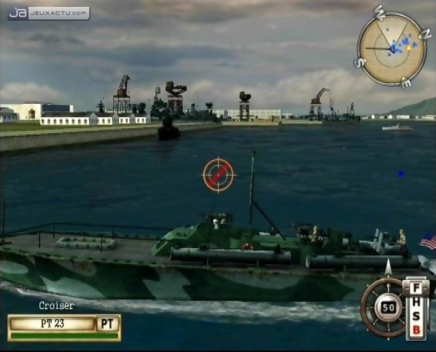 Avec plus de 60 appareils aériens ou navals à contrôler, un petit tour du côté du mode "tutorial" s’impose surtout que Battlestations : Midway cache bien son jeu avec son aspect doucement stratégique occulté par une campagne de promotion mettant l’accent sur un gameplay résolument arcade. Et lorsque je dis "un petit tour", comprenez par là plus de trois quarts d’heure à engranger un maximum d’informations. Et comme à l’école, ça rentre par une oreille et ça ressort par l’autre même avec la plus grande attention. Quelle en est la raison ? Assurément à trop vouloir en faire, les développeurs n’ont pas trouvé un gameplay homogène, ce qui signifie que les configurations des boutons et les actions réalisables seront différentes que vous pilotiez un FAF Wildcat, dirigiez un PT Boat ou manoeuvriez un sous-marins. On commencera donc doucement en se familiarisant avec le gouvernail d’un bateau. Dans la majorité des cas, le stick analogique gauche gère la vitesse d’un appareil grâce aux directions haut et bas tandis que la gauche ou la droite déplaceront l’engin. Au contraire, le second stick peut avoir deux fonctions différentes soit le contrôle de l’angle de vue pour les bateaux et les sous-marins, soit les séquences de voltiges en plein air. Une fois les bases bien acquises, l’heure est à l’utilisation de l’artillerie. Du fait des nombreux appareils disponibles, l’arsenal augmente en nombre : canons d’artillerie, canons antiaérien (AA), grenades sous-marines ou encore torpilles. Il va sans dire que tous les bâtiments ne proposent pas le même équipement ni la même façon d’attaquer. De plus cet entraînement offensif met l’accent sur les avantages et les inconvénients d’un type d’armes de sa vitesse de rechargement, à sa visée. Afin de vous faciliter la tâche, un jeu de couleurs à l’écran affiche les caractéristiques techniques de l’arme sélectionnée car il faut savoir que votre arsenal ne propose pas des munitions illimitées et ni une invulnérabilité totale aux tirs ennemis. Il faudra parfois rebrousser chemin pour se réapprovisionner ou ouvrir le panneau de réparation afin de limiter les dégâts.