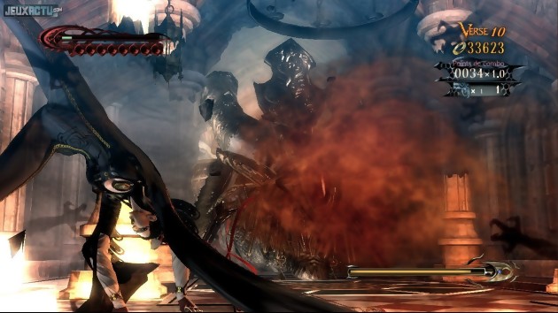 Inventif dans son système de fight, Bayonetta se montre également ingénieux quand il s’agit de gérer les checkpoints. Nombreux au cours de l’aventure, ils sont surtout placés à des moments clefs, empêchant le joueur d’être frustré mais laissant néanmoins une certaine marge de challenge pour qu’il s’agisse tout de même d’un titre destiné avant tout aux harcore gamers. Avec seize chapitres plus un épilogue, Bayonetta offre une durée de vie plutôt convenable pour un beat’em all et notre compteur qui affiche près de 15 heures de jeu confirme que plusieurs soirées (ou nuits, c’est selon) seront nécessaires pour rencontrer Jubileus, le créateur, un dernier boss à la taille complètement démesuré. A ce propos, sachez que Bayonetta repousse les limites du genre en proposant au fur et à mesure de l’aventure des boss de plus en plus imposants. Au jeu de celui qui en a la plus grosse, Bayonetta affiche certainement le plus de testostérone avec des monstres tellement gigantesques qu’en dézoom complet, Bayonetta n’est plus qu’une vulgaire fourmi qu’on distingue à peine à l’écran. Et pourtant, malgré la taille ahurissante de ces ennemis, malgré leur nombre toujours plus important et le nombre d’animations qu’affichent certains affrontements, la fluidité n’est en rien altérée, du moins sur Xbox 360. La version PlayStation 3 connaît effectivement quelques baisses de frame-rate çà et là, mais rien de bien dramatique ; en tout cas, pas au moins de péter un plomb et retirer deux points à la note finale.