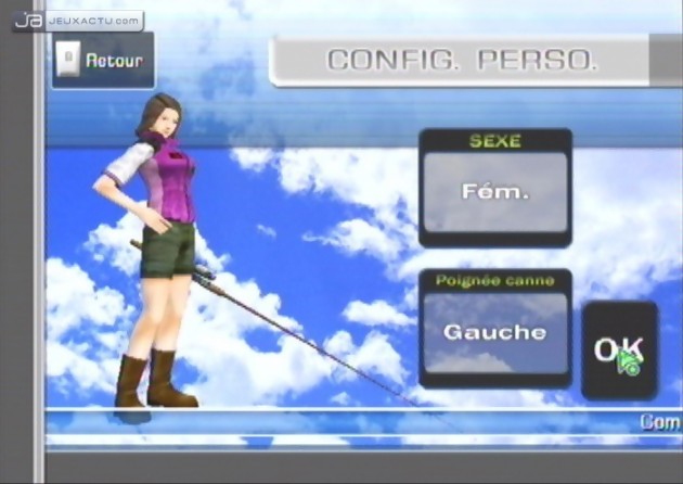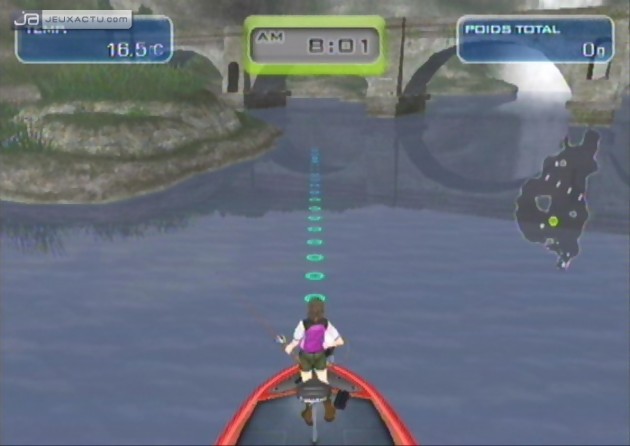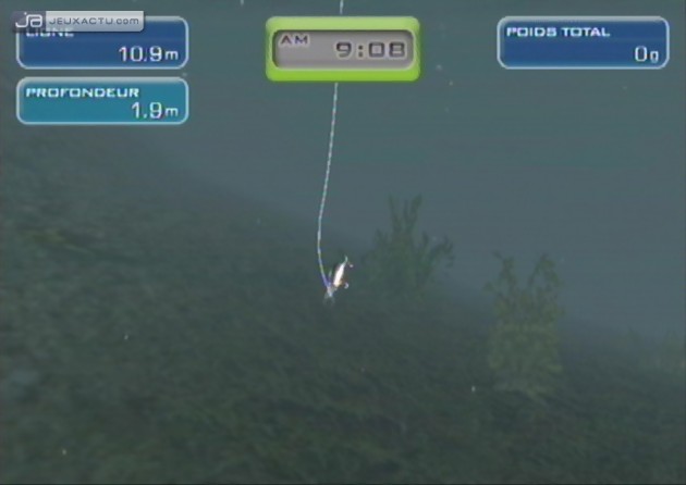 Car il faut reconnaître que les poissons se font plutôt capricieux dans Big Catch Bass Fishing, même en sillonnant les endroits les plus peuplés. Pour faire dans la subtilité, le joueur dispose de plusieurs lancers - par-dessus, de coté, en revers, en pitching -, ainsi que de plusieurs leurres - surface, moyen, profondeur, fond - pour attraper toutes sortes de poissons. Le problème c'est que la reconnaissance de mouvements est à la rue, et lancer sa ligne dans l'eau devient rapidement un calvaire ; d'autant plus que le fait de devoir presser, puis relâcher A en mimant le geste n'est pas une idée lumineuse. Big Catch Bass Fishing peut être taquiné avec la Wiimote seule, ou couplée au Nunchuck, ce dernier servant dans ce cas à enrouler sa ligne. Lorsqu'un poisson mord à l'hameçon, il faut donner un coup de poignet pour engager le combat. Des talents de pêcheur ne sont absolument pas requis, à partir du moment où l'on suit correctement les indications - gauche, droite, haut, bas - qui s'affichent à l'écran, tout en moulinant astucieusement sa ligne. La couleur de la canne - bleue, jaune, rouge - renseigne sur la résistance du poisson, avec le risque de voir sa ligne casser si on n'adopte pas le bon geste au bon moment. En fait, il faut essayer de suivre le mouvement du poisson tout en le ramenant intelligemment vers la barque. Rien de sorcier. Pour habiller un peu le tout, Big Catch Bass Fishing nous propose de visiter plusieurs endroits - cascade, barrage, cabane, rochers... - où les poissons sont censés se réunir, avec la possibilité de sélectionner les conditions climatiques, l'heure de la journée, et même la saison. Pêche sportive oblige, un mode Tournoi est de mise, et le vainqueur est celui qui réussit à attraper les poissons les plus lourds. Un système de classe à également été mis en place, afin de différencier les newbies des killers. Enfin, la connexion Wi-Fi permet jusqu'à quatre joueurs de s'affronter en ligne, un bonus que certains ne goûteront même pas. Quant à la laideur de la réalisation, elle se passe de commentaire.