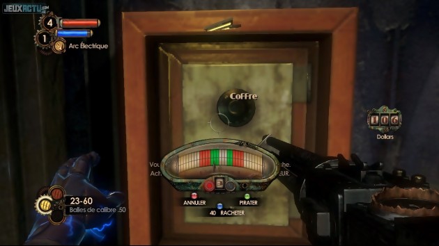 Autre innovation importante : il est maintenant possible d'utiliser conjointement les plasmides et les armes. Désormais ambidextre, le nouveau héros n'a plus besoin de jongler entre les deux catégories et peut dans le même instant geler un ennemi et lui asséner un bon coup de fusil à pompe. Le gameplay en devient nettement plus nerveux, et donc plus appréciable. Manifestement désireux de réduire les temps morts, les développeurs ont également totalement revu la fonction de piratage des systèmes électroniques. Fini le mini-jeu à la Pipemania, place à un système plus souple et plus intuitif ! Affiché en surimpression de l'action et ne l'interrompant donc pas, il consiste à arrêter au bon moment une aiguille effectuant des va-et-vient sur un cadran analogique divisé en différentes sections. Il faut généralement réussir l'action trois ou quatre fois de suite, sur des zones de plus en plus petites, avant que le piratage soit validé. Plus subtil qu'il n'y paraît au premier abord, cet outil laisse au joueur la liberté de prendre des risques. Si le but initial est de s'arrêter sur les cases vertes, on peut également tenter les cases bleues, plus difficiles à atteindre mais plus rémunératrices. En cas de réussite bleutée, on obtient en effet des bonus qui varient selon le dispositif hacké. Les postes de soin nous délivrent une trousse gratuite, les distributeurs de munitions quelques cartouches supplémentaires, les coffres contiennent plus d'argent, les robots et les tourelles font plus de dégâts, les alarmes des caméras durent plus longtemps, etc. Signalons d'ailleurs que l'on dispose d'un pistolet capable de lancer des fléchettes de piratage, ce qui simplifie nettement l'accès aux tourelles et caméras. Autre simplification notable : les fortifiants que l'on peut collectionner ne sont plus divisés en différentes catégories mais regroupés en un seul bloc. A l'usage, cette gestion facilitée des bonus passifs s'avère plutôt agréable. En revanche, on ne peut que pester contre l'aide excessive concernant les portes fermées par un code d'accès. Si votre héros a vu ou entendu le code auparavant, celui-ci s'affiche carrément à côté du cadenas... même si en tant que joueur vous ne l'aviez pas du tout remarqué lorsque vous l'avez croisé. A plusieurs reprises, on rentre donc le code sans même savoir comment on l'a obtenu ! Une concession aux "casuals" dont on se serait volontiers passé...