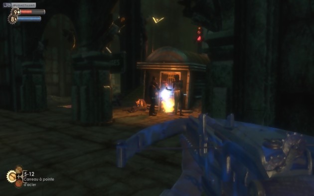 Impossible de ne pas penser, en traversant des corridors dévastés, en croisant des cadavres mutilés ou en contemplant des documents tachés de sang, à des titres comme Condemned ou Silent Hill. L’atmosphère poisseuse qui règne dans les ruelles à l’éclairage vacillant constitue finalement la meilleure arme de vos ennemis… et la plus grande qualité de BioShock. Cette ambiance tout à fait particulière, autrement plus effrayante que celle qui règne dans certains titres se proclamant horrifiques, est servie par un merveilleux travail sur le son. Alternant des thèmes jazzy enjoués, crachés par des hauts parleurs de mauvaise qualité, avec des envolées symphoniques du plus bel effet, les différentes compositions, souvent recouvertes par des bruitages plus vrais que nature, et des messages publicitaires très réussis, entretiennent le stress du joueur. Mais nulle bande-son ne saurait être parfaite sans un doublage de qualité, et bien des titres réussis ont été gâchés par des comédiens français lamentables. Là, vous vous dites : "c’est foutu, je vais devoir l’acheter en version américaine !…" et vous avez tort ! Casting impeccable, direction d’acteurs sans faille, la VF est absolument exemplaire. Quelques voix sont un poil moins dans le ton, mais BioShock est définitivement ce que l’on a entendu de mieux depuis… depuis bien trop longtemps. Tous ces éléments contribuent à faire de cette expédition à la fois brutale et poétique, sinistre et passionnante, une expérience unique, à vivre absolument… si vous en avez les moyens. A test exclusif, conditions particulières, c’est chez Take 2 que nous avons pu jouer à BioShock, sur une machine qui n’est pas prête de rejoindre la poubelle. Core2 Duo 2,2 GHz, GeForce 8800 GTS, 2 Go de Ram, le matériel mis à disposition était de qualité. Evidemment, avec tout ça, toutes les options pouvaient être poussées à fond, les chargements les plus importants (chargement initial et changement de zone) ne dépassaient pas les 25 secondes et l’action ne subissait aucun ralentissement. Les joueurs petitement équipés, eux, ne seront peut-être pas si bien lotis. Mais l’optimisation semble être le fort de 2K Games. Il suffit d’entendre les confrères vanter les qualités de la version Xbox 360 pour s’en convaincre. Et finalement, à part ces éventuelles contraintes de hardware, on voit mal ce qui pourrait vous arrêter de goûter à ce nectar ludique. Le mauvais goût, peut-être ?