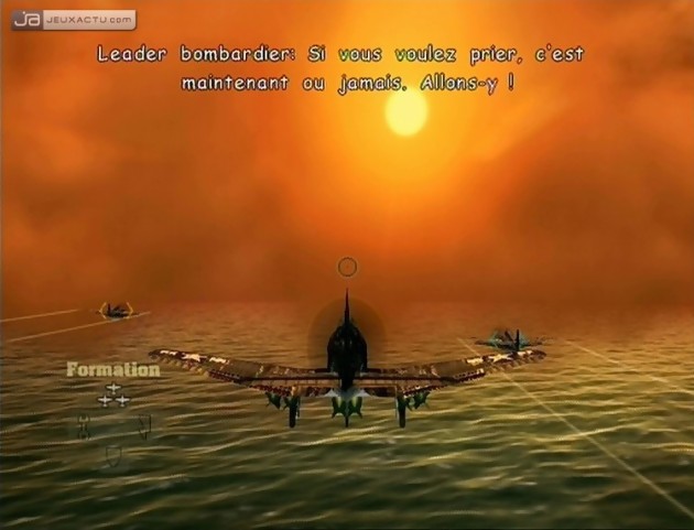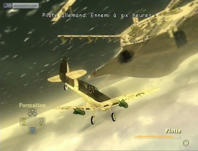Pas besoin de speech pour mettre en scène les dogfights qui vous attendent dans Blazing Angels : Squadrons of WWII. La seule petite chose que l’on peut dire concernant votre escadron, c’est que vous êtes un peu les Frères d’Armes des cieux. A bord de votre coucou, vous ne serez jamais seul face à l’ennemi mais combattrez aux côtés de trois autres soldats américains : Joe, Frank et Tom. Et comme vous pouvez vous en douter chacun possède des compétences spéciales que vous apprendrez à utiliser dès les premières missions. Via la croix multidirectionnelle de la manette, vous pourrez ordonner à vos hommes de modifier leurs attitudes au combat. Par défaut, ils volent en formation à vos côtés mais cette pratique n’est guère payante sous le feu ennemi car il sera beaucoup plus difficile de viser les avions adversaires sans shooter ses collègues. C’est pourquoi vous pouvez les envoyer au charbon en basculant en Mode Attaque. Dès lors, ils attaqueront les cibles ennemies afin de faire un maximum de dégâts. Mais pour certaines missions nécessitant de défendre une base militaire ou des bombardiers en plein vol, vous devrez valider le Mode Défensif. Vos confrères se chargeront alors d’éliminer les avions représentants un risque pour la mission. Mais là n’est pas leurs compétences spéciales citées plus haut. Dans le cas de Joe, il sera d’une aide importante au cours des missions. Si votre Spitfire ou votre P51 Mustang commence à sentir le roussi, vous pourrez lui demander de réparer votre avion en appuyant sur la direction gauche du D-pad. Vous devrez alors suivre une combinaison de boutons à l’écran pour que notre réparateur de service parvienne à restaurer comme par magie votre appareil en plein vol. Tom a un rôle beaucoup plus défensif. Grâce à sa manœuvre Taran, il pourra vous débarrasser des gêneurs gaspillant leurs balles dans votre sillage. Enfin, Frank, le leader du trio, fera moins dans la finesse que ses coéquipiers avec une attaque qui détruira une cible désignée ainsi que tous les avions regroupés en formation autour de cette proie.