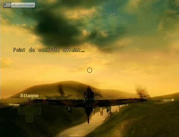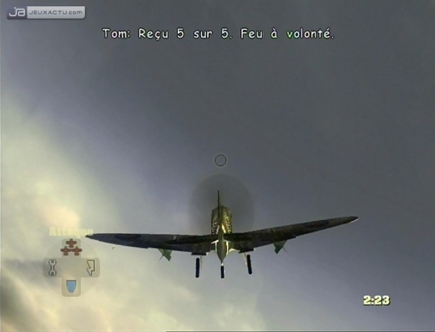 Pas besoin de speech pour mettre en scène les dogfights qui vous attendent dans Blazing Angels : Squadrons of WWII. La seule petite chose que l’on peut dire concernant votre escadron, c’est que vous êtes un peu les Frères d’Armes des cieux. A bord de votre coucou, vous ne serez jamais seul face à l’ennemi mais combattrez aux côtés de trois autres soldats américains : Joe, Frank et Tom. Et comme vous pouvez vous en douter chacun possède des compétences spéciales que vous apprendrez à utiliser dès les premières missions. Via la croix multidirectionnelle de la manette, vous pourrez ordonner à vos hommes de modifier leurs attitudes au combat. Par défaut, ils volent en formation à vos côtés mais cette pratique n’est guère payante sous le feu ennemi car il sera beaucoup plus difficile de viser les avions adversaires sans shooter ses collègues. C’est pourquoi vous pouvez les envoyer au charbon en basculant en Mode Attaque. Dès lors, ils attaqueront les cibles ennemies afin de faire un maximum de dégâts. Mais pour certaines missions nécessitant de défendre une base militaire ou des bombardiers en plein vol, vous devrez valider le Mode Défensif. Vos confrères se chargeront alors d’éliminer les avions représentants un risque pour la mission. Mais là n’est pas leurs compétences spéciales citées plus haut. Dans le cas de Joe, il sera d’une aide importante au cours des missions. Si votre Spitfire ou votre P51 Mustang commence à sentir le roussi, vous pourrez lui demander de réparer votre avion en appuyant sur la direction gauche du D-pad. Vous devrez alors suivre une combinaison de boutons à l’écran pour que notre réparateur de service parvienne à restaurer comme par magie votre appareil en plein vol. Tom a un rôle beaucoup plus défensif. Grâce à sa manœuvre Taran, il pourra vous débarrasser des gêneurs gaspillant leurs balles dans votre sillage. Enfin, Frank, le leader du trio, fera moins dans la finesse que ses coéquipiers avec une attaque qui détruira une cible désignée ainsi que tous les avions regroupés en formation autour de cette proie.