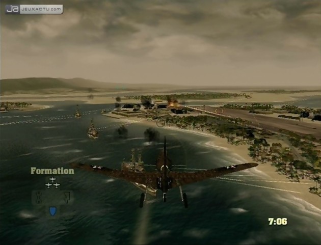 Ne vous inquiétez pas, ce n’est pas parce qu’ils proposent des qualifications synonymes de victoire que vous allez vous tourner les pouces sagement et en retrait de l’action. C’est sur vos frêles épaules que repose le succès des 18 Missions du Mode Campagne. Si en règle générale vous devez éliminer les assaillants aériens en appuyant comme un forcené sur la gâchette RT afin de faire retentir votre mitrailleuse, certains objectifs vous demanderont de détruire des troupes au sol, des tanks et même de torpiller des porte-avions. Les armes secondaires sont gérées par le clic sur le stick analogique droit et ne sont disponibles que sur certains types d’avions. Vous ne pourrez donc pas choisir votre arsenal au préalable. Cela dit, les missions ne nécessitent pas toujours l’utilisation des torpilles, des bombes ou des missiles. Parfois même, vous devrez changer d’appareil en cours de partie. Si les tirs de missiles sont d’une simplicité enfantine puisque associés au viseur des mitraillettes, torpiller ou bombarder sera beaucoup plus délicat car régi par un autre curseur. Lâcher une bombe sur un convoi nazi ou sur la flotte japonaise s’opère grâce à un cercle glissant sur le sol et qui s’illuminera lorsque vous pourrez faire mouche. Placer une attaque sous-marine via les torpilles sollicitera une précision accrue en se fiant à une jauge de distance et de hauteur placée sous votre viseur. On retrouve également ce gameplay pour les missions de repérage où vous devez prendre des photos de vos adversaires depuis votre avion. Mais vos ennemis ne vont pas vous laisser faire sans broncher et c’est tant mieux car ainsi on peut assister à des dogfights dits « spectaculaires » où les manœuvres de voltiges seront légions. Plutôt axé arcade, le pilotage des avions de Blazing Angels : Squadrons of WWII est plutôt aisé pour peu que l’on ait le sens de l’orientation car c’est souvent la tête en bas qu’il faudra détruire un Zero ou un Messerschmitt allemand. Heureusement pour ne pas s’y perdre, vous pourrez locker un adversaire grâce à la caméra de ciblage (LT) localisation l’ennemi. Vous pourrez ainsi faire des loopings ou des vrilles afin de vous placer dans ses 6 heures. Qu’elles soient exécutées à petite ou grande vitesse, elles manquent de rythme ce qui rend les dogfights un tantinet soporifiques malgré la présence de dizaines d’avions dans le ciel.