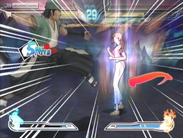 Ce dernier n’est malheureusement pas au bout de ses peines puisque du côté du gameplay, on ne peut pas dire que Sega se soit foulé la patte. Pourtant habitué à nous offrir des jeux de baston de qualité, Virtua Fighter en tête de liste, la firme du hérisson bleu peine à convaincre lorsqu’il faut allier gameplay 2D et jouabilité à la Wii. Car dans Bleach : Shattered Blade, il n’existe pas d’alternative possible en branchant une manette GameCube ou autre, tout se joue au Nunchuk et à la Wiimote pour le plus grand désarroi des amateurs de technicité que nous sommes. Faire de la Wiimote le Zanpakuto (l’arme d’un Shinigami), tel était le pari audacieux de Sega. Pour ce faire, plusieurs coups ont été intégrés pour s’adapter aux mouvements réalisés par le joueur. En balançant la Wiimote vers le bas, le personnage exécute un mouvement de coupe, tandis que balancer la télécommande vers la gauche ou la droite permet de trancher dans le vif du sujet. A l’inverse, pour poignarder son ennemi, il suffit de pousser la zappette vers l’avant. A ces attaques peuvent être conjuguées le bouton A qui permet d’augmenter la force de frappe, donnant naissance à ce que Sega appelle les attaques critiques. Trois mouvements basiques, indispensables sur le papier, mais totalement hasardeux une fois en pleine partie. Car on a beau trouver tous les prétextes du monde entier, jouer à un jeu de baston en remuant un accessoire dans tous les sens n’offre rien de concluant, et encore moins de bien technique pour tous ceux qui cherchent un tant soit peu de finesse.
