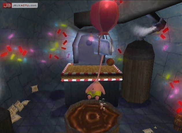 Bob l’Eponge : le Film se présente de prime abord comme un jeu de plate-forme classique comme on en voit défiler des dizaines devant nos yeux chaque trimestre. Il est vrai que THQ fait trop souvent dans le jeu de plate-forme et notamment avec la licence Bob l’Eponge. Mis à part un jeu compatible EyeToy (Bouge avec Bob l’Eponge et ses amis), il fallait se contenter de titres sans saveur. Mais en plaçant le développement de Bob l’Eponge : le Film sous la tutelle de Heavy Iron Studios, responsable des très moyens Scooby-Doo : la Nuit des 100 Frissons, Les Indestructibles, et de l’exécrable Evil Dead : Hail To The King, ils ont réussi à produire un jeu rythmé et fidèle à la série. Bref tout a été multiplié par deux pour ce jeu : deux personnages, deux gameplays pour un plaisir double. Pour ce qui est des séquences de plate-forme pure, là on est en terrain connu puisqu’il faut mixer attaques et sauts afin de progresser tout au long des 18 niveaux du jeu. Chaque personnage possède ses propres coups spéciaux et il faudra souvent zapper de héros pour mener à bien une mission. Notre célèbre éponge est assez polyvalente grâce aux attaques Propulso-bulles, Fulguro-bulles, Karatésquive et Guitare à Onde Sonique. Patrick, quant à lui, fait plutôt dans l’esthétisme avec sa Pirouette et sa Roue, ou a contrario fait dans le gras avec le Popotinsplash. Il faudra manier de main de maître ces attaques pour mettre à terre les différents ennemis qui vous barreront le chemin. Sans être vicieux, ils sont suffisamment nombreux par moments pour vous faire mordre la poussière. Fort heureusement, ces passages-là sont l’occasion de se défouler un bon coup mais également un bon moyen de gagner un max d’haltères. Les haltères sont une sorte de récompenses gagnées au fur et à mesure de vos combats, de votre exploration et de vos pulsions destructrices. En fouinant les paysages de Bikini Bottom ou Shell City et en cassant certains caisses, vous gagnerez ces petits bonus synonymes de virilité. A la manière d’un RPG, vous allez pouvoir évoluer après un certain nombre d’haltères ramassés. Augmenter votre jauge de santé, découvrir de nouvelles attaques ou upgrader certaines techniques offensives, vous êtes libre de personnaliser Bob ou Patrick à votre guise. C’est donc scrupuleusement que l’on ramassera un max d’haltères afin de devenir un homme le plus vite possible.