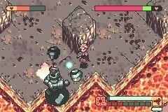 Durant tout le jeu, vous allez incarner Django (vous pouvez opter pour un autre prénom), un jeune garçon, avide de vengeance après la mort de son père, tué par le Count. Pour cela, le héros se rend à Istraken, la cité de la mort où se réunissent tous les suceurs de sang, armé de son Gun Del Sol, épousant son destin de tueur de vampires. Pour compléter sa vendetta, il va devoir, de manière très classique, enchaîner des combats dans des donjons face à des ennemis divers et variés jusqu’à atteindre l’inévitable boss. Enoncé tel quel, Boktai pourrait sembler très classique. Or, il n’en est rien. Je m’explique : dans Boktai, l’élément central est le soleil ou plus précisément, l’intensité de la lumière du jour. Au début du jeu, vous devez entrer date, heure et lieu où vous vous trouvez. Le monde dans que vous allez parcourir va alors évoluer en fonction de ces données. En effet, nuit et jour dans le jeu vont coïncider avec la réalité et cela aura son importance. Outre l’utilisation du soleil en tant que munition sur lequel nous reviendrons plus tard, le comportement des ennemis, les Undead, change avec la luminosité. Certains seront plus lents en plein soleil alors que d’autres sont étourdis dans la pénombre. La luminosité a également une influence sur les décors. Dans Permafrost, un niveau gelé, par exemple, certains blocs de glace fondent avec l’exposition de la GBA au soleil. Le jeu fourmille de petits détails de la sorte qui lui confèrent une atmosphère profondément originale. L’utilisation du capteur solaire se fait toutefois dans une utilisation bien plus belliqueuse. En effet, votre arme, le Gun del Sol tire son énergie des rayons solaires. Pour le recharger à l’extérieur des donjons, vous aurez donc besoin de la lumière du soleil, plus celle-ci étant forte, plus vite les batteries de votre arme se remplissant. A l’intérieur des donjons, vous pourrez au choix utiliser des solar nuts, des petites noix que l’on trouve principalement dans des coffres, vous servir des stations solaires disséminées de-ci de-là ou encore vous approcher d’une lucarne laissant entrer la lumière du jour. Une autre utilisation de la lumière se fait après une victoire face à un boss Immortel, vous devez alors traîner le cercueil du vaincu à l’air libre afin de le placer sur un endroit bien spécifique appelé Pile Drive afin de les purifier. Le cercueil est alors placé au centre d’un dispositif envoyant des faisceaux lumineux afin de le détruire. Ces faisceaux baissant d’intensité avec le temps, vous devrez alors les alimenter sans cesse grâce à votre arme pendant que le boss vous enverra de nombreuses attaques. Lors de ces phases de jeu, plus la lumière sera forte, plus votre arme se rechargera vite et plus les coups portés par les faisceaux au boss seront importants. Autant vous dire que si vous n’avez pas au moins quatre de niveau d’intensité lumineuse, ce sera très difficile dans la plupart des cas. Il en résulte que l’on purifie les boss en journée alors que la soirée est plutôt réservée à l’exploration des petits donjons. D’autres utilisations sont faites de la lumière du soleil, notamment la culture de plantes avec l’arbre solaire mais je ne vais pas vous gâcher toutes les surprises que réservent le jeu. Un conseil toutefois, ne restez pas trop au soleil, à la fois pour vous éviter les coups de soleil mais également quelques problèmes dans le jeu...