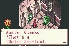 A l’évocation d’un jeu utilisant l’énergie solaire, les plus anciens (donc moi…) se souviendront des Game & Watch qui utilisaient ce mode d’alimentation plutôt que les habituelles piles. Avec Boktai, on est très loin des procédés d’énergie alternatifs chers aux écolos, puisque le soleil n’est pas ici utilisé comme source d’énergie mais comme un véritable élément du jeu dont il va falloir tenir compte. Pour cela, la cartouche de Boktai est munie d’un petit capteur sensible au rayonnement de l’astre. Une jauge vous indiquera l’intensité du soleil, une barre correspondant à un soleil très timide alors que pour le cap des huit barres soit atteint, il faudra jouer sous un soleil de plomb ; le soleil parisien de ce début de mois de juin ne m’ayant pas permis de dépasser le cap des sept barres… Et pas la peine d’essayer l’exposition à toutes sortes de sources de luminosité pour compenser le manque de soleil, seules les lampes à UV peuvent vous permettre de tricher.
