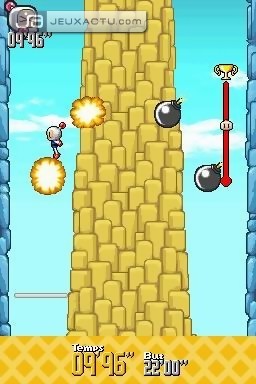 Première surprise plutôt inattendue, la refonte du mode "Aventure". Fini les différentes zones à traverser en bombardant ennemis et boss. Ici, les développeurs ont décidé de mettre intelligemment à profit les caractéristiques de la machine. Dans un parc d’attractions en 3D isométrique, le stylet vous guidera à la recherche de mini-jeux. Compte tenu du support, ils exploitent bien évidemment écran tactile et micro pour un plaisir propre à la portable de Nintendo, avec en prime un nombre assez conséquent et une certaine variété. Mais si l’idée de départ est bonne, elle est assez mal implantée dans les faits. Monotonie et lassitude auront raison de vous lors des incessants allers-retours qu’il faut effectuer pour explorer et débloquer chaque zone du parc, brisant du même coup toute envie d’achever l’aventure. Certains en viendront même à regretter le mode solo classique qui offrait au moins une véritable progression et un vrai challenge. Développeur à l’origine de la démocratisation des party-games avec la série des Mario Party, Hudson Soft a heureusement eu la bonne idée de reprendre une partie du concept et l’adapter au bien nommé mode Attraction. Jouable jusqu’à quatre en game sharing, vous pourrez revisiter tous les mini-jeux débloqués dans le mode solo, leur donnant ainsi une seconde jeunesse et vous permettant de profiter du concentré de fun qu’ils offrent entre amis. Mais un Bomberman n’en serait pas un sans son mythique mode "Bataille". Mode ayant fait la renommée de la série, c’est en toute logique que l’on retrouve exactement la même recette. Il s’agira donc encore une fois de s’affronter dans des arènes à coups de bombes. Bizarrement, Hudson Soft a amputé son titre d’une partie des items que l’on trouvait autrefois. Fini le crâne et autres gants de boxe par exemple. Outre le jeu en réseau local instauré dans le premier opus DS, nous avons droit ici au très attendu mode online. Jouable jusqu’à huit avec cependant quatre bots imposés, voilà qui permet aux exilés et autres solitaires d’affronter autre chose que des adversaires contrôlés par la console. Jouable et fluide contre nos voisins européens, lag et crises de nerfs accompagneront les parties intercontinentales. A éviter donc, ces désagréments sont d’autant plus dommage que les joueurs sont bien moins présents sur le Vieux Continent. Toutefois, ne faisons pas la fine bouche, cela suffit amplement au bonheur de chacun.