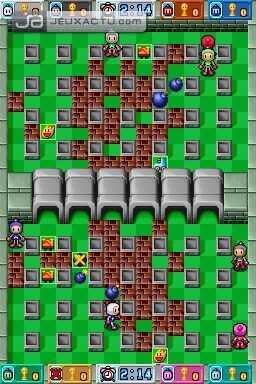 Première surprise plutôt inattendue, la refonte du mode "Aventure". Fini les différentes zones à traverser en bombardant ennemis et boss. Ici, les développeurs ont décidé de mettre intelligemment à profit les caractéristiques de la machine. Dans un parc d’attractions en 3D isométrique, le stylet vous guidera à la recherche de mini-jeux. Compte tenu du support, ils exploitent bien évidemment écran tactile et micro pour un plaisir propre à la portable de Nintendo, avec en prime un nombre assez conséquent et une certaine variété. Mais si l’idée de départ est bonne, elle est assez mal implantée dans les faits. Monotonie et lassitude auront raison de vous lors des incessants allers-retours qu’il faut effectuer pour explorer et débloquer chaque zone du parc, brisant du même coup toute envie d’achever l’aventure. Certains en viendront même à regretter le mode solo classique qui offrait au moins une véritable progression et un vrai challenge. Développeur à l’origine de la démocratisation des party-games avec la série des Mario Party, Hudson Soft a heureusement eu la bonne idée de reprendre une partie du concept et l’adapter au bien nommé mode Attraction. Jouable jusqu’à quatre en game sharing, vous pourrez revisiter tous les mini-jeux débloqués dans le mode solo, leur donnant ainsi une seconde jeunesse et vous permettant de profiter du concentré de fun qu’ils offrent entre amis. Mais un Bomberman n’en serait pas un sans son mythique mode "Bataille". Mode ayant fait la renommée de la série, c’est en toute logique que l’on retrouve exactement la même recette. Il s’agira donc encore une fois de s’affronter dans des arènes à coups de bombes. Bizarrement, Hudson Soft a amputé son titre d’une partie des items que l’on trouvait autrefois. Fini le crâne et autres gants de boxe par exemple. Outre le jeu en réseau local instauré dans le premier opus DS, nous avons droit ici au très attendu mode online. Jouable jusqu’à huit avec cependant quatre bots imposés, voilà qui permet aux exilés et autres solitaires d’affronter autre chose que des adversaires contrôlés par la console. Jouable et fluide contre nos voisins européens, lag et crises de nerfs accompagneront les parties intercontinentales. A éviter donc, ces désagréments sont d’autant plus dommage que les joueurs sont bien moins présents sur le Vieux Continent. Toutefois, ne faisons pas la fine bouche, cela suffit amplement au bonheur de chacun.