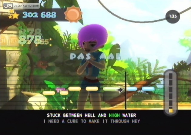Heureusement, la partie chant de Boogie est bien moins catastrophique que les cours de danse proposée par Electronic Arts. Et pour cause ! Repompant sans vergogne le système élaboré par Sony dans SingStar, il s’agit ici de fredonner les paroles qui s’inscrivent à l’écran, afin de placer sa voix dans les bonnes mesures. Puisque la cible visée reste avant tout enfantine, la tolérance est poussée à l’extrême et même les pires casseroles peuvent s’en tirer avec les honneurs. Des Jackson 5 aux Red Hot Chili Peppers en passant par Jamiroquai, Britney Spears, Black Eyes Peas, The Village People ou bien encore Daft Punk, la playlist est éclectique, même s’il est vrai qu’on aurait préféré avoir les morceaux originaux que de simples reprises. C’est d’ailleurs l’une des seules et principales qualités de ce Boogie qui propose également un mode "Movie Clip", permettant de se prendre pour un Alex Dumay ou un Mathieu Rochefeuille puissance 5. Si Boogie se montre fade en solo, la partie à deux relève un peu l’intérêt bien qu’il faille se choper un micro supplémentaire pour retrouver un peu le sourire. Car il est de bon ton de préciser que même à deux, la partie danse reste aussi déplorable. Au moins, c’est dit !