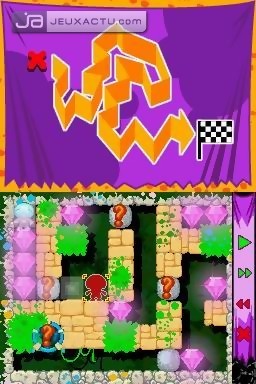 Ca, c'est pour le mode "Planet Tour". En "Route Race", l'univers reste le même, mais cette fois on trace à l'avance, et au stylet (pas du tout exploité dans la première partie du jeu) le trajet que doit prendre Rockford. Il faut bien réfléchir car on doit parfois le faire passer deux fois au même endroit, gérer les obstacles, les changements qui peuvent intervenir dans le niveau une fois qu'il a creusé telle galerie... Si le premier mode avait des allures de casse-tête, celui-ci est encore pire ! Enfin, on a aussi droit à une vingtaine de niveaux à jouer en contre la montre, où le chrono s'avère particulièrement sadique, ainsi qu'un mode deux joueurs dans lequel chacun doit trouver la sortie plus vite que l'autre. Sympathique mais pas inoubliable. Quant aux graphismes, très colorés, ils sont mignons tout plein et collent parfaitement avec les musiques simplettes mais entrainantes. Dommage toutefois que parfois, les niveaux paraissent un peu chargés et demandant un petit temps d'adaptation pour faire la distinction entre les différents éléments.