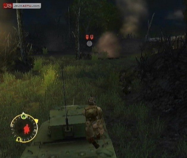 En plus de se démarquer de la concurrence grâce à une formidable mise en abîme, la série Brothers in Arms a détourné l’aspect FPS militaire sur console en proposant un système de jeu stratégique, évitant ainsi de tomber dans le shoot bourrin caractérisant certaines sagas sur le déclin. Si, tout au long du jeu, vous incarnez le Sergent Joe Hartsock, ce sont bien évidemment les hommes qui vous suivent qui tiennent un rôle prépondérant dans le déroulement des opérations. N’imaginez galoper tel un coq en patte dans la campagne normande, fusillant de votre Thompson les soldats nazis se pointant dans votre viseur, sinon votre nom ornera le monument aux morts du patelin dans lequel vous avez courageusement fait face à l’ennemi. Dans Brothers in Arms : Earned in Blood, vous apprendrez les tactiques militaires employées par les libérateurs de la France à travers l’utilisation de l’équipe d’appui-feu et de l’équipe d’assaut. Travaillant en binôme, ces deux escouades s’avèrent particulièrement efficaces lors de situations critiques, quand vous ne pouvez traverser un village sans risquer de perdre l’un de vos camarades à cause d’un groupe d’Allemands particulièrement bien organisés. A ce moment-là, il conviendra d’ouvrir le feu sur ces hommes avec une équipe pendant que vous déplacez vos coéquipiers vers une zone moins dégagée. Les tirs de couverture obligeront vos ennemis à se retrancher, bien à l’abri des balles en attendant une opportunité de vous faire la peau. Ce petit jeu de cache-cache est signalé à l’écran à l’aide d’icônes. Le rouge signifie que vous avez identifié le danger et que vous connaissez la position des Allemands et que ces derniers vous le rendent bien grâce à un feu nourri. Mais lorsque vos camarades tireront sur les hommes d’Hitler, l’icône rouge se muera en cercle gris annonçant un temps de répit des hostilités. A ce moment-là, c’est à vous de jouer grâce à une manœuvre de contournement afin de prendre à revers les Boches, comme on les appelait à l’époque.