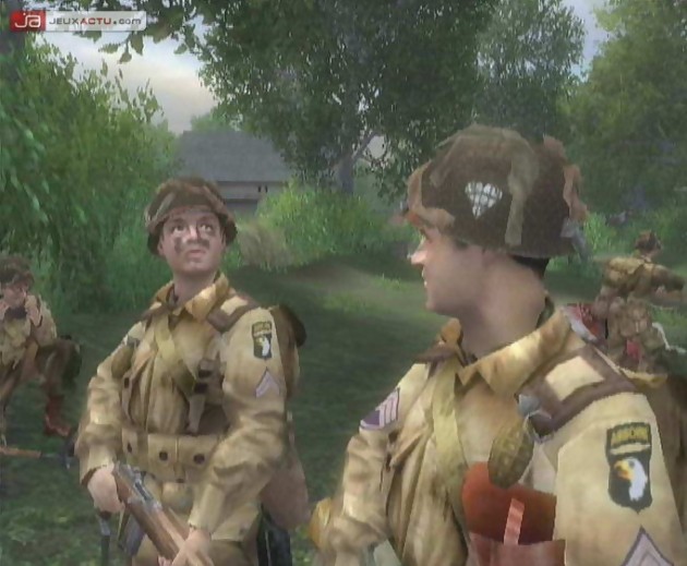 Le parti pris de proposer un jeu qui tire ses inspirations de faits réels permet au joueur de s’attacher à la personnalité des soldats de la compagnie. Brothers in Arms s’articule autour d’un groupe de soldats, unis aussi bien sur le terrain que dans la vie finalement. Les développeurs ont réussi à créer une osmose entre les différents personnages et le doublage français de qualité apporte encore plus de crédit à cette union amicale. De plus, sa mise en scène remarquable permet de s’imprégner de l’ambiance du titre, appuyée elle-même par la présence d’un très bel effet de flou sur l’image qui donne au jeu un cachet unique. Si, de manière générale, la plupart des textures manquent de finesse, l’ensemble graphique reste de bonne facture et le level-design se montre relativement bien conçu pour apprécier le jeu à sa juste valeur. En contre partie, il faudra se contenter de décors qui se déroulent en grande partie dans la campagne normande et donc en extérieur.