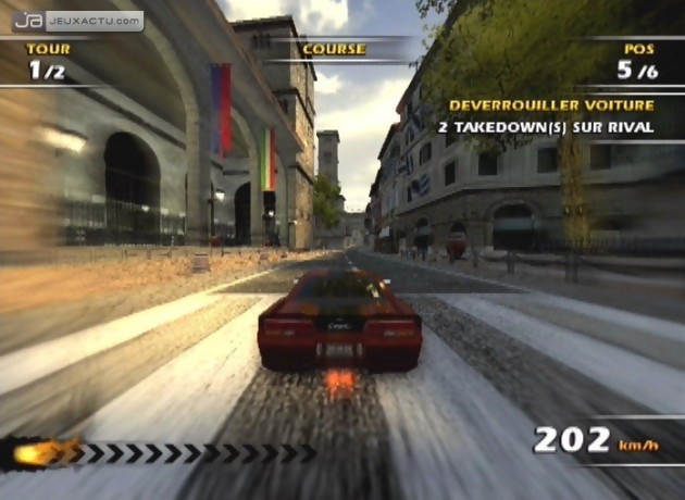 C’est d’ailleurs l’un des nombreux objectifs imposés par le mode "Tour Mondial" du jeu, l’équivalent du mode "Carrière". On ne vous apprend rien mais le mode "Tour Mondial" est la case obligatoire pour débloquer l’ensemble des voitures, des circuits et des bonus supplémentaires, permettant de faire grimper l’intérêt du jeu de façon conséquente. Si l’on retrouve les modes désormais connus de la série (Course, Road Rage, Eliminateur, Contre la montre et Grand Prix), on peut également découvrir de nouveaux ajouts tels que le mode Déjanté et Défi. Le premier consiste à enchaîner le maximum d’objectif en un temps record afin d’atteindre un certain score, tandis que le second nous oblige à réaliser des objectifs bien précis pendant la course (réaliser deux Takedowns sur un concurrent bien précis par exemple). La difficulté monte crescendo et devrait tenir en haleine les chauffards du dimanche.