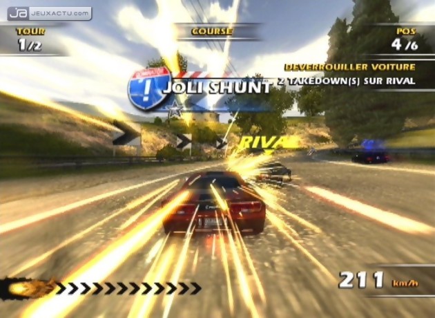 C’est d’ailleurs l’un des nombreux objectifs imposés par le mode "Tour Mondial" du jeu, l’équivalent du mode "Carrière". On ne vous apprend rien mais le mode "Tour Mondial" est la case obligatoire pour débloquer l’ensemble des voitures, des circuits et des bonus supplémentaires, permettant de faire grimper l’intérêt du jeu de façon conséquente. Si l’on retrouve les modes désormais connus de la série (Course, Road Rage, Eliminateur, Contre la montre et Grand Prix), on peut également découvrir de nouveaux ajouts tels que le mode Déjanté et Défi. Le premier consiste à enchaîner le maximum d’objectif en un temps record afin d’atteindre un certain score, tandis que le second nous oblige à réaliser des objectifs bien précis pendant la course (réaliser deux Takedowns sur un concurrent bien précis par exemple). La difficulté monte crescendo et devrait tenir en haleine les chauffards du dimanche.