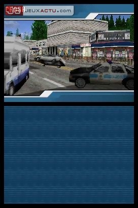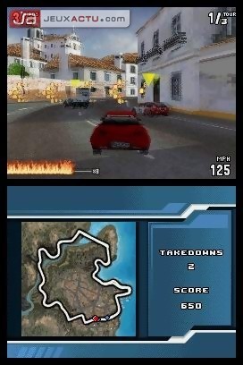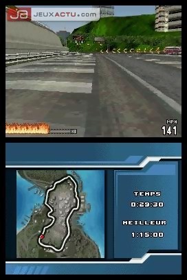 Pourtant, tout n’est pas à jeter dans Burnout Legends sur DS. Les différents et nombreux modes de jeux nous rappellent que nous sommes en possession de la réplique parfaite de la version PSP en termes de contenu. "Tour du monde", "course simple", "multijoueur", il ne manque plus que le mode "crash", néanmoins accessible dans le mode "Carrière". Sur le modèle des autres versions, ce dernier se découpe en plusieurs catégories de voitures. Compact, Muscle, Coupé, Sport et enfin Super, autant de types de véhicules différents à débloquer en fonction des médailles et de l’argent que l’on glanera au fil des épreuves réussies. Les courses sont réparties sur trois continents : Etats-Unis, Europe et Asie et chaque localité propose un type de courses et de tracés bien distincts. Bref, ceux qui ont déjà joué à Burnout connaissent sur le bout des doigts cette façon d’opérer. Jusque-là tout va bien. Ce n’est qu’une fois dans le menu de sélection de son bolide qu’on se rend compte que la DS a bien du mal à rivaliser face à la PSP, ou même à convaincre lorsqu’il faut afficher des graphismes en 3D. La modélisation des véhicules n’a jamais été aussi immonde et un effort vous sera demandé pour tenter de les reconnaître. Le constat d’échec est le même pour les environnements qui font franchement peine à voir. Certes, on arrive à reconnaître certains tracés mais les contours cubiques et tout cet amas de pixels grossiers nous donnent envie de détourner le regard. Pas facile de chasser de son esprit les graphismes époustouflants de la version PSP de Burnout Legends. Certes, la comparaison n’est pas de taille, les deux supports étant diamétralement différentes, mais le titre étant le même d’un support à un autre, il est difficile de ne pas en faire le rapprochement.