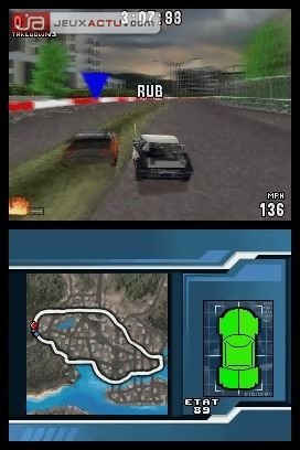 Malheureusement, le résultat ne fait que s’aggraver une fois lancé sur l'asphalte. Même s’il est resté très arcade, le pilotage des bolides n’a désormais plus rien à voir avec les autres versions de Burnout. Au moindre coup de volant sur les côtés, soyez sûr que votre voiture ira s’écraser, dans le meilleur des cas, directement contre le décor. Autrement, celui-ci traversera les textures pour ensuite disparaître dans les méandres de l’espace 3D. Et oui, Burnout Legends sur DS pullule de bugs de collision en tout genre, surtout au moment d’un crash où les véhicules n’hésiteront pas à se chevaucher les uns les autres. Ce qui est censé être l’élément le plus impressionnant dans la série, les accidents dans Burnout Legends sur DS n’ont jamais été aussi miséreux. Aucun effet pyrotechnique, ni même d’angle de vue dynamique, les bolides cognent les murs comme une mouche s’écrase sur un pare-brise. Par ailleurs, ne ratez surtout pas l’effet engendré par le crashbreaker, vous risquez de passer à côté de l’un des moments les plus comiques du jeu. Histoire d’enfoncer le clou un peu plus profond, n’espérez pas retrouver les musiques pourtant si entraînantes de la version PSP, elles ont été ici composées à l’aide d’un synthétiseur Bontempi. Que reste-il alors ? Notre seul lot de consolation réside dans la possibilité d'affronter un ou plusieurs camarades avec une seule cartouche. Pas franchement suffisant pour nous faire oublier la médiocrité du titre. Peut-être la vitesse d’animation, qui réussit à nous procurer quelques sensations de vitesse, mais uniquement en vue interne. Finalement, c'est bien peu et il ne faudra pas s'étonner que l'on boycotte le jeu.
