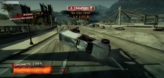 Ce dernier a d’ailleurs été revu et corrigé dans Burnout Paradise, puisqu’après plusieurs tentatives, Criterion Games a tout simplement décidé de condenser toutes leurs idées passées dans ce même volet. Le Burnout n’est désormais plus identique à tous les bolides mais se divise en trois catégories différentes : "Vitesse", "Cascade" et "Agression". En effet, en fonction du véhicule choisi, celui-ci affiche des paramètres différents en fonction du comportement qu’adopte le pilote sur la route. Pour les caisses estampillées "Vitesse", la jauge de boost peut être utilisée à n’importe quel moment, tandis que les véhicules griffés "Cascade" sont obligés d’attendre que la jauge soit à son maximum pour faire appel à la nitro. Rien de bien révolutionnaire en soi, mais le fait d’avoir intégré ces subtilités dans le même épisode permet de changer son type de conduite, et ainsi varier les plaisirs. En parlant de variété, il est de bon ton de savoir qu’il existe un total de 120 épreuves disséminées dans Paradise City. Repérables très facilement sur le radar à l’aide d’une icône de couleur différente, les courses et autres épreuves se distinguent sur la route grâce aux feux tricolores pour la plupart du temps. "Course", "Road Rage", "Traque", "Séquence Cascade" et "Parcours Burning", on retrouve peu ou prou les mêmes défis proposés dans les anciens épisodes de la série. C’est en réalité le mode "Crash" qui a été abandonné au profit d’un mode "Showtime", accessible à n’importe quel moment de la partie en appuyant sur la touche correspondante. Moins travaillé que le mode "Crash", il permet néanmoins de faire exploser un maximum de véhicules, afin de faire grimper son score crédité en dollars et ainsi améliorer son permis, gage d’une certaine expérience sur la route. De quoi devenir un vrai petit chauffard.
