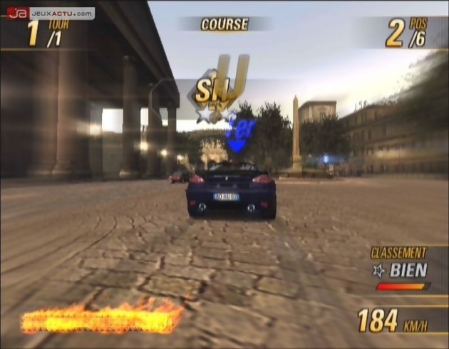 Passée cette déception et une fois des circuits plus complexes débloqués, le charme de Burnout agit de nouveau et on redevient vite tout feu tout flamme. Les courses s’enchaînent, les heures défilent lors de notre tour du monde et les explosions viendront vite illuminer des accidents toujours plus spectaculaires. Le crashbreaker apparu dans le mode Crash de Burnout 3 : Takedown deviendra d’ailleurs disponible en course pour peu qu’il vous reste assez de nitro à carboniser et, au-delà des aftertouch takedowns, ce sont désormais des revanches explosives qui vous permettront d’atomiser jusqu’à cinq véhicules adverses en simultané. Les récompenses pour ce genre d’exploit viendront alors côtoyer les défis régionaux et il faudra compter une bonne vingtaine d’heures pour espérer venir à bout du titre incluant également un tout nouveau mode crash. Très aérien, celui-ci a subi un sérieux lifting et il faudra apprendre à choisir les véhicules les plus efficaces pour chaque épreuve, en prenant en compte leur degré d’explosion mais aussi leur poids pour mieux résister à un vent qui a désormais son rôle. Plus techniques, ces accidents aussi spectaculaires soient-ils restent tout de même au second plan et on préférera écumer les routes sur des circuits qui demanderont pas mal de kilomètres avant d’en connaître tous les secrets..