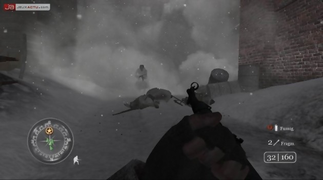 Russes, anglais et américains, tous se sont alliés pour vaincre la menace nazie et, une fois de plus, c’est au fil de campagnes propres à chaque nation que vous allez, arme au poing, partir sur les champs de batailles, entourés de vos frères d’infortune. Des rues enneigées de Stalingrad aux bords du Rhin en Allemagne, en passant par les désormais traditionnelles côtes de Normandie ou encore les déserts égyptiens, les batailles épiques vont s’enchaîner comme autant de balles sifflant à vos oreilles et rythmer un Call of Duty 2 à la réalisation bluffante. Après un rapide entraînement bolchevique, vos premiers affrontements comptent en effet bien mettre en avant les nouvelles prouesses techniques du titre d’Infinity Ward et c’est à quelques mètres seulement de votre point de départ que le jeu affiche sa nouveauté : les fumigènes. Au-delà d’un rendu visuel exceptionnel donnant une réelle densité aux fumées, cette nouvelle fonctionnalité aura rapidement son emprise sur le gameplay, offrant un barrage visuel permettant d’avancer de précieux mètres vers l’ennemi. On évitera ainsi les tirs de sniper ou de balistes surpuissantes le temps de passer d’une couverture à une autre avant de se lancer dans un face à face mortel pour reprendre le contrôle du bâtiment jusque là squatté. Si la majorité des missions vous demanderont justement de récupérer ces positions dites stratégiques, les phases les plus éprouvantes restent sans aucun doute celles où il faut tenir une position sous le feu d’une armée allemande bien souvent en surnombre, avec une mention toute particulière pour