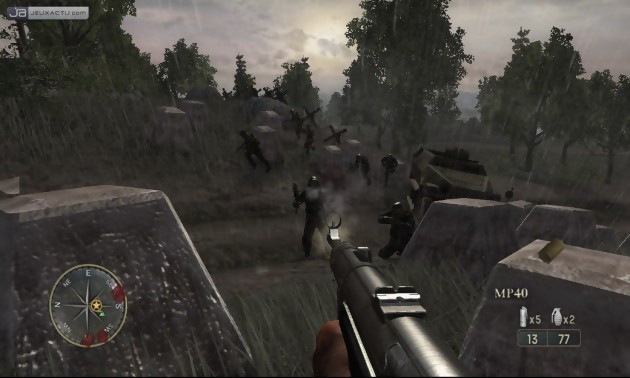 En revanche, ce qui n’a pas changé dans Call of Duty 3 : En Marche vers Paris, c’est bien la gestion des coéquipiers et de l’intelligence artificielle des ennemis. La série n’a jamais été une référence en matière d’I.A. et ce n’est pas Call of Duty 3 qui viendra déroger à la règle. Les Allemands foncent toujours tête baissée et mettent souvent du temps à appuyer sur la gâchette. Le challenge est davantage mis du côté du nombre, voire du surnombre de soldats allemands à l’écran qui respawnent assez souvent de manière visible ou anormale, surtout lorsque le joueur s’amuse à sortir des indications données pour continuer l’histoire sans accroc. Parmi les points fâcheux de Call of Duty 3 : En Marche vers Paris, on peut souligner une gestion des grenades totalement aberrantes. Grenades que l'on peut d'ailleurs renvoyer à l'envoyeur si on se montre rapide. Désormais, plus besoin de fuir à des kilomètres lorsqu’une grenade tombe à nos pieds, il y a peu de chance de nous tuer sur le champ. Au pire, c’est une blessure grave mais jamais de mort subite. Cet atout ou défaut, c’est selon fonctionne également chez l’ennemi qui ne succombe pas toujours à une déflagration. Bizarre, vous avez dit bizarre ?