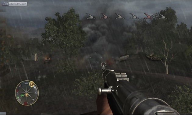 Sur ce point, Call of Duty 3 : En Marche vers Paris ne faillit pas à la réputation de la série ; et le joueur qui aura déboursé 70 € aura de quoi s’émerveiller sur les séquences de bravoure et de combat qui s’enchaînent à tour de bras. Explosions à tire-larigot, ennemis qui hurlent comme des sauvages dans la langue de Goethe, balles qui fusent de part et d’autre et qui ricochent parfois sur le casque, les développeurs ont accéléré la cadence par rapport au dernier épisode, à défaut de grandes nouveautés. C’est d’ailleurs un point sur lequel on peut pas trop accabler Call of Duty 3 : En Marche vers Paris qui mise donc une fois encore sur une mise en scène spectaculaire et cinématographique. L’aspect technique a été revu à la hausse et on ne se loupera pas en disant que Call of Duty 3 : En Marche vers Paris est plus beau que son prédécesseur. Il suffit de voir par exemple la modélisation des personnages, bien plus convaincantes que par le passé, notamment au niveau des uniformes qui comportent bon nombre de plis. On est loin d’un Gears of War mais dans l’ensemble, le titre reste très plaisant à regarder et peut dignement faire partie de la famille des jeux next gen’. Les décors ont également été le fruit d’un travail de qualité avec des environnements qui fourmillent de détails et d’animations. Contempler ces champs d’herbe et ces branches d’arbres se plisser au gré du vent est un spectacle saisissant. En parlant de vent, les développeurs avaient énormément mis l’accent sur le fait que cet élément naturel avait un rôle déterminant dans le jeu, dans la mesure où il servait à dissiper plus rapidement un écran de fumé créé par une grenade fumigène. Il faut croire que Treyarch nous a bien baratiné car à aucun moment, cet élément apparaît dans le jeu…