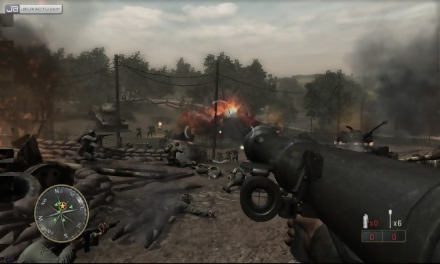 Le close combat batte action n’est pas le seul aspect interactif qui a été ajouté dans Call of Duty 3 : En Marche vers Paris. Désormais, le joueur a davantage le sentiment de participer à cette guerre atroce, grâce à la mise en scène de nouvelles actions. Poser un détonateur sur un tank ou canon anti-aérien ne se fait plus seulement en appuyant sur une simple touche. Il va falloir se montrer un peu plus habile avec les touches et autres sticks analogiques de la manette pour réussir la manœuvre. Expliquez comme ça, on a l’impression qu’il s’agit d’une révolution. Sans vouloir créer de fausse joie, sachez que là aussi l’interaction est limitée mais surtout répétitive. Autrement, on note l’introduction de phases motorisées, en jeep et en tank. Ce n’est pas une première pour la série et encore moins pour le genre mais dans Call of Duty 3, le joueur ne se contente plus de tirer à partir d’une mitraillette, d’ailleurs, il ne le fait qu’une seule fois et pendant un court moment. Non, désormais, c’est en tant que conducteur qu’il va falloir se montrer à la hauteur. Deux vues sont possibles : première et troisième personne. La première vue – celle par défaut – permet une immersion plus grande mais les différents chemins possibles nous empêchent d’avoir une grande visibilité. C’est pourquoi en cliquant sur le stick analogique droit, il est possible d’avoir une vue plus ample mais surtout plus cheap. Les personnages nous donnent l’impression d’être des marionnettes désarticulées et le pilotage du véhicule est tout bonnement cheap à souhait, avec une physique de la jeep assez pitoyable. A l’inverse, les séquences en tank sont plus intéressantes avec là aussi deux vues disponibles. Peu importe, ce n’est pas vraiment sur cet aspect que mise Call of Duty 3, même si le but est tout de même d’approfondir le sentiment d’immersion.