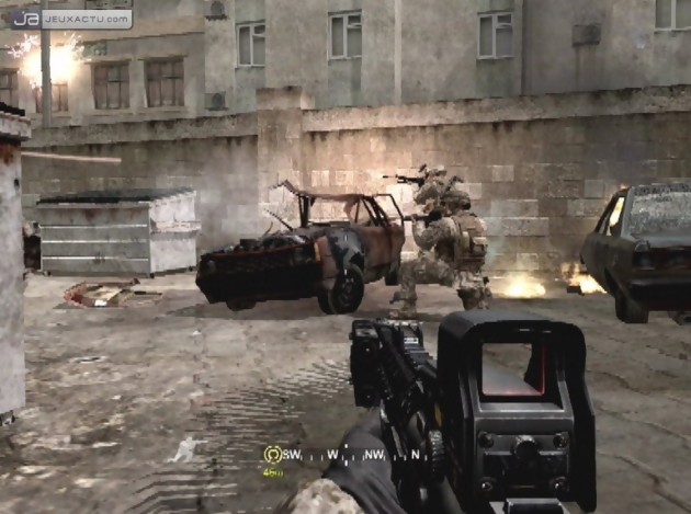 Jouant la carte du script à fond les ballons, Call of Duty 4 : Modern Warfare parvient néanmoins à aérer son gameplay grâce à des maps beaucoup moins dirigistes que par le passé. S’il s’agit toujours de suivre les ordres de son supérieur, le capitaine Price, il arrive à de nombreuses reprises de devoir prendre des décisions de son plein gré. C’est en effet souvent le cas lors des prises d’assaut ou des batailles croisées où compter simplement sur ces coéquipiers ne suffit pas pour faire reculer l’ennemi. Dans ce capharnaüm visuel et sonore, il est souvent nécessaire de prendre les devants en pénétrant dans un immeuble, prenant l’ennemi sur les flancs ou alors battre en retraire pour ne pas finir trop vite à la morgue. Si l’intelligence artificielle n’est pas forcément le point fort du titre, quoiqu’elle parvient de temps en temps à nous surprendre, le nombre parfois hallucinant d’ennemis à l’écran nous oblige souvent à reprendre la partie depuis le dernier checkpoint. Que les affamés de la gâchette se rassurent, la difficulté est présente, d’autant que d’autres éléments extérieurs aux tirs ennemis, viennent aussi participer à la descente aux enfers. Il n’est pas rare par exemple de croiser le chemin de Dobermann ou de Bergers Allemands à l’apparence sympathique, mais qu’il faudra abattre pour ne pas finir en os à ronger. Ces confrontations avec ces ennemis canins permettent d’avoir droit à quelques séquences en QTE où il faudra appuyer sur la bonne touche au bon moment pour leur infliger des coups de couteau, ou alors leur tordre le cou.
