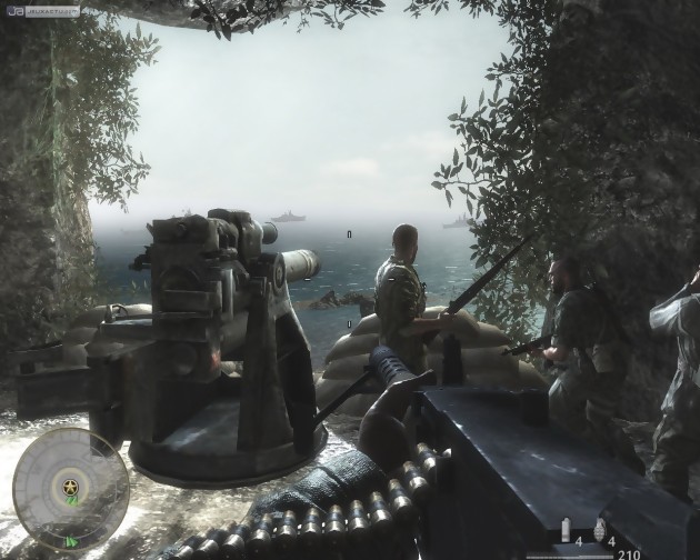 Le jeu nous place alternativement dans la peau d'une recrue russe, évoluant de Stalingrad à Berlin, et dans celle du soldat Miller, plongé dans les conflits du Pacifique. Au vu des autres caractéristiques de ce Call of Duty 2008, on pourrait presque qualifier ce dernier point d'innovation majeure ! Car on se retrouve à combattre des japonais qui, comme le prouve leur tendance persistante à manger avec des baguettes et à avoir les yeux bridés, sont des gens étranges. Fourbes (comme tous les asiatiques), ils n'hésitent pas à se planquer dans les arbres pour mieux vous allumer, à sortir inopinément d'abris camouflés dans le sol, ou tout simplement à vous foncer dessus en hurlant, tels des kamikazes prêts à se sacrifier pour la victoire de l'Empire. L'utilisation de ces clichés (qu'il ne fallait bien évidemment pas prendre au premier degré dans les phrases précédentes...) a au moins ceci de positif qu'elle fait légèrement varier le gameplay, obligeant le joueur à scruter attentivement les décors ou à faire appel à ses réflexes, pour contrer d'un coup de couteau bien placé les corps à corps impromptus. Quant aux décors tropicaux faits d'herbes hautes, ils sont parfaits pour expérimenter les effets dévastateurs de la nouvelle arme à la mode : le lance-flammes ! Sans être révolutionnaire, cet outil est assez amusant à utiliser, et surtout très pratique pour nettoyer les bunkers.