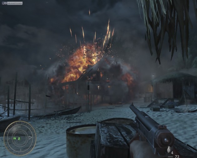 Le jeu nous place alternativement dans la peau d'une recrue russe, évoluant de Stalingrad à Berlin, et dans celle du soldat Miller, plongé dans les conflits du Pacifique. Au vu des autres caractéristiques de ce Call of Duty 2008, on pourrait presque qualifier ce dernier point d'innovation majeure ! Car on se retrouve à combattre des japonais qui, comme le prouve leur tendance persistante à manger avec des baguettes et à avoir les yeux bridés, sont des gens étranges. Fourbes (comme tous les asiatiques), ils n'hésitent pas à se planquer dans les arbres pour mieux vous allumer, à sortir inopinément d'abris camouflés dans le sol, ou tout simplement à vous foncer dessus en hurlant, tels des kamikazes prêts à se sacrifier pour la victoire de l'Empire. L'utilisation de ces clichés (qu'il ne fallait bien évidemment pas prendre au premier degré dans les phrases précédentes...) a au moins ceci de positif qu'elle fait légèrement varier le gameplay, obligeant le joueur à scruter attentivement les décors ou à faire appel à ses réflexes, pour contrer d'un coup de couteau bien placé les corps à corps impromptus. Quant aux décors tropicaux faits d'herbes hautes, ils sont parfaits pour expérimenter les effets dévastateurs de la nouvelle arme à la mode : le lance-flammes ! Sans être révolutionnaire, cet outil est assez amusant à utiliser, et surtout très pratique pour nettoyer les bunkers.