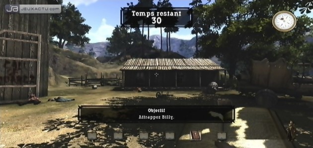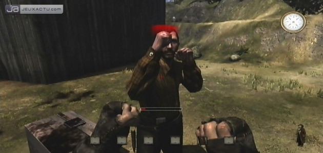 C’est souvent dans ces cas de figure que l’on remarque de Call of Juarez manque d’un je-ne-sais-quoi qui pourrait le rendre plus lisible. Tout d’abord, les différents objectifs à atteindre sont mal indiqués même grâce à la boussole affichée à l’écran. Mais ce sont surtout les ennemis qui sont beaucoup plus chauds à débusquer. Ils peuvent tranquillement vous allumer la gueule pendant que vous cherchez à les repérer. Et les zones de couleurs indiquant à l’écran la direction des tirs ne vous aident en rien, bien au contraire on ne sait plus trop où donner de la tête. Evidemment, dans ces conditions on se fait vite toucher bêtement tant et si bien qu’il faut régulièrement battre en retraite pour récupérer sa santé. D’ailleurs, on meurt encore plus bêtement qu’on se fait toucher dans Call of Juarez. Le level-design du jeu, qui paraît pourtant super vaste, est très réduit et parfois une simple dénivellation vous empêche de progresser ou de contourner un adversaire. Et puis lorsque ce ne sont pas les limites de la carte qui nous jouent des tours, c’est sa construction qui devient déplaisante notamment pour les phases de plates-formes. Plus présentes avec Billy qu’avec le révérend, ces séquences vous obligent à répéter inlassablement les mêmes actions en cas d’erreur. Déplacer une caisse pour en atteindre une autre, la replacer un peu plus haut pour pouvoir grimper, ça va deux minutes surtout que les objets utilisés n’ont pas tout le temps droit à une physique crédible. Mais le plus horripilant concerne les aptitudes de Billy à s’agripper à une paroi. Seul problème, ça marche seulement aux endroits clefs et une fois sur deux. Désagréable tout comme l’utilisation du fouet pour s’accrocher à un arbre. Si vous n’êtes pas placé au pixel près, l’action est irréalisable. Décidemment, ce bon vieux Billy « La Bougie » en prend pour son grade.