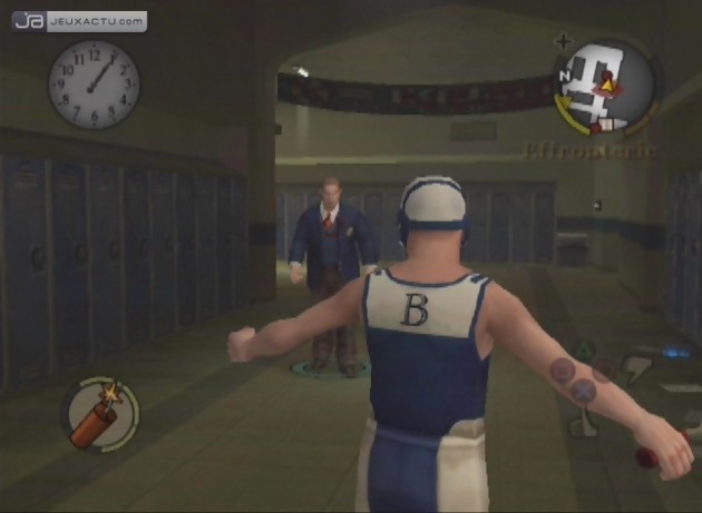 Et oui, on ne rigole pas à la Bullworth Academy. Brutaliser un camarade de classe, faire l’école buissonnière, vandaliser les biens du lycée, épier les jeunes filles dans leur dortoir ou bien encore oublier d’enfiler son uniforme est immédiatement sanctionné par le règlement. Dans chacun des cas cités, c’est la colle immédiate. Mais avant de se faire attraper par le col, Jimmy peut détaler comme un lapin pour tenter de semer les préfets ou s’il se fait rattraper, il peut encore se débattre pour prendre la poudre d’escampette. Mais pour évoluer sereinement dans le jeu, mieux vaut parfois se tenir à carreau et pour faire de Jimmy un élève assidu et ainsi gagner en expérience, mieux vaut assister de temps en temps à quelques cours d’anglais, de dessins, de chimie ou de gym. C’est la case obligatoire pour pouvoir débloquer des aptitudes mais aussi profiter de la richesse du gameplay. Les cours sont représentés par des mini-jeux, assez originaux sans non plus être bien compliqué. Pour les cours de dessins, le but est de tracer des formes rectangulaires sans se faire toucher par l’une des icônes qui se baladent sur le dessin. Rapidement, il faut révéler le croquis. Le cours de chimie consiste à appuyer sur le bon bouton au bon moment, tandis que les séances de gym permettent à Jimmy de pratiquer différents sports, ce qui lui permet par la suite de débloquer de nouveaux mouvements. Il existe plusieurs niveaux pour chacun de ces cours et vous vous doutez bien que la difficulté grimpe crescendo.