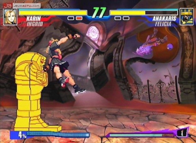 Nostalgiques, on ne peut que l’être lorsqu’on se retrouve, manette en mains, devant ce Capcom Fighting Evolution. Premier étonnement, le nombre de participants s’élève à 23 (21 + 2 à débloquer), ce qui est relativement faible pour un jeu de baston actuel, quant on sait que la moyenne tourne plutôt autour d’une quarantaine de persos. On ne peut pas dire que Capcom s’est foulé la patte pour la sélection puisque sur les 23 personnages, 14 d’entre eux sont issus de la série des Street Fighter. Le reste se partage entre Darkstalkers (Vampire en japonais) et Red Earth (Warzard pour la version originale) et le choix n’a pas été déterminé par leur charisme ou leur efficacité. Bref, pour le coup, l’hommage censé être rendu à Capcom n’est pas de meilleur goût. Ce coup de Calgon de la part des développeurs se retrouve également du côté des graphismes. Laissons de côté le fait que Capcom n’est pas opté pour une 2D en haute résolution façon Guilty Gear, ce n’est pas ce qui est le plus gênant dans l‘histoire. Non, là où l’on se sent obligé de taper du poing sur la table, c’est au niveau des personnages. Capcom s’est en effet contenté de reprendre les sprites originaux de chacun des participants des séries choisies et de les balancer pêle-mêle dans le jeu. On se retrouve alors avec des contrastes énormes entre chaque bonhomme, sans compter que les décors donnent l’impression d’avoir été réalisés au crayon pastel. Foutrement déroutant pour une première approche.