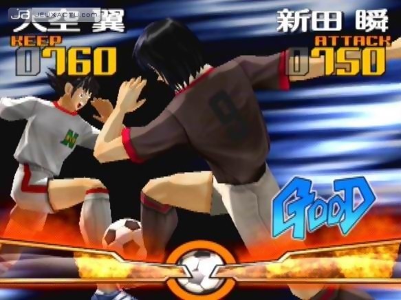 La possession de la balle repose donc essentiellement sur un système de timing malheureusement assez flou, que l’on n’a jamais vraiment la sensation de maîtriser. Chaque aspirant au cuir possède une jauge d’énergie, qui risque de baisser si l’exercice de timing, qui consiste à appuyer trois fois sur une touche à un instant précis, n’est pas exécuté à la perfection. C’est en tout cas celui qui garde sa jauge la plus remplie qui remporte l’action, quelle que soit sa nature, et donc qui s’octroie la balle. Marquer un but repose sur un principe assez similaire, si ce n’est que cette fois il est intéressant de découvrir une combinaison précise de trois touches qui permettra au faucon de prendre son envol, à la feuille morte de piquer au sol, au tigre de transpercer la cage thoracique du portier adverse, bref de faire comme dans la mythologie Olive et Tom. Concrètement pour un tir, de l’exercice de timing dépend un nombre de points de force de frappe, et ce nombre peut être amoindri par l’intervention d’éventuels défenseurs suicidaires, si des membres du verrou adverse se trouvaient devant vous au moment où vous avez décidé d’enclencher la frappe. Mais c’est bien entendu au gardien de faire le plus gros du travail. Chaque portier dispose d’un chiffre de référence, par exemple 600. Pour que la balle entre dans le filet, sa puissance doit être supérieure au chiffre de référence du gardien, après qu’il ait effectué son arrêt en mimant la séquence timing effectuée par l’attaquant. Et, malheureusement, cela n’arrive pas très souvent puisque de manière générale, il est trop facile pour un gardien de stopper n’importe quelle balle à moins de s’être vraiment endormi pendant le timing. Il faut donc se créer de vraies occasions pour que le tir de base dispose d’une force de frappe déjà conséquente, et il ne reste plus qu’à prier pour réussir un ou deux Critical dans le timing pour crucifier l’homme ganté.