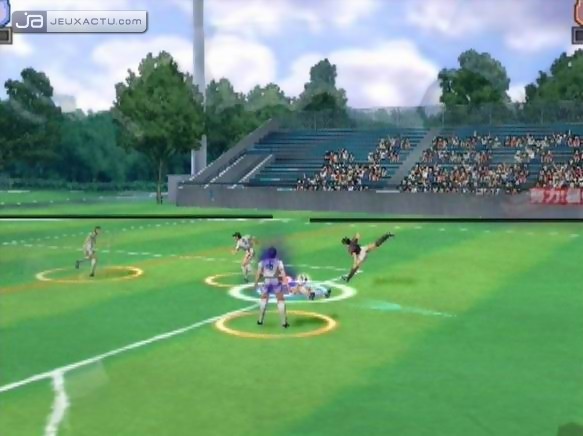 Il y a donc une véritable nécessité de réfléchir à la construction de ses actions dans Captain Tsubasa, mais le gros point noir, c’est que marquer un but repose exclusivement sur ce système de points très rigide. En aucune façon le jeu ne prend en compte votre position sur le terrain au moment du tir, par exemple. Du coup, selon que l’on shoot du milieu de terrain ou à deux mètres des cages, le gardien n’est pas plus en difficulté, or il aurait été judicieux de remettre en question l’équilibre trop bien calibré de la formule. A quoi ça sert d’être un dribbleur de génie si peu importe le placement ? Un match de Captain Tsubasa est de toutes façons très saccadé, avec des interruptions menu et des duels systématiques, dont la réussite repose sur un système de timing qui ne figure pas parmi les plus judicieux. Contraignant aussi, même si le terrain est très rapidement remonté, de voir sa défense passive laisser en permanence les attaquants adverses tirer. On peut certes influer sur ses équipiers avec le stick droit, mais finalement pas assez. L’intelligence artificielle n’est de toutes façons pas le fort de l’équipe adverse non plus, notamment quand le gardien s’amuse à dégager le ballon sur le défenseur juste à côté de Tsubasa. En revanche il est intéressant d’avoir rendu les joueurs vulnérables en prenant en compte l’épuisement. Après avoir enrhumé quatre défenseurs à la suite, Tsubasa lui même n’aura plus assez de jus dans sa jauge d’énergie pour s’en sortir en cas d’une nouvelle agression.