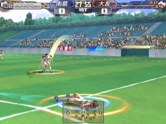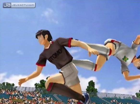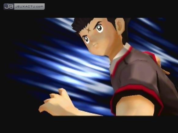 Reste enfin un jeu simplifié à l’extrême dans ses à-côtés : les coups de pieds arrêtés sont tirés automatiquement, un unique tacle est disponible pour engager le contact, et ne cherchez pas la faute, il n’y a pas d’arbitre de toutes façons. Tout ceci afin de maintenir une fluidité et que l’action ne tombe pas, ce qui s’avère pourtant immanquablement le cas avant chaque passe/centre/tir. Ce constat est d’ailleurs aggravé en mode deux joueurs, dans lequel la vue bascule vers un jeu de football classique afin de ne pas séparer l’écran en deux. De même on ne dirige pas qu’un seul joueur, mais l’ensemble de l’équipe, donc en mode deux joueurs Captain Tsubasa à le postérieur entre deux tabourets et aurait peut être du devenir un jeu de foot classique, en conservant simplement son système de défis. En effet, dans le cadre d’un jeu à deux, le fait que l’action soit stoppée à la moindre passe devient rapidement un tue-l’amour ludique en puissance, et la frénésie des événements scéniques ne parvient plus à nous détourner de l’ennui et de la frustration. Techniquement, pour ne pas déroger à la tradition des adaptations d’anime de Bandai Namco Games, le jeu est bien évidemment hideux, encore que étant donné le côté sommaire du graphisme original de Yôichi Takahashi, on pourrait presque parler de fidélité esthétique. On reconnaît d’ailleurs sans peine Olivier Atton, Marc Landers, Ben Becker, ou encore les frères Derrick (les patronymes français, c’est juste pour emmerder les puristes) et c’est probablement le principal. Dommage quand même que la réalisation soit naze au point de se mettre à ramer de temps en temps.