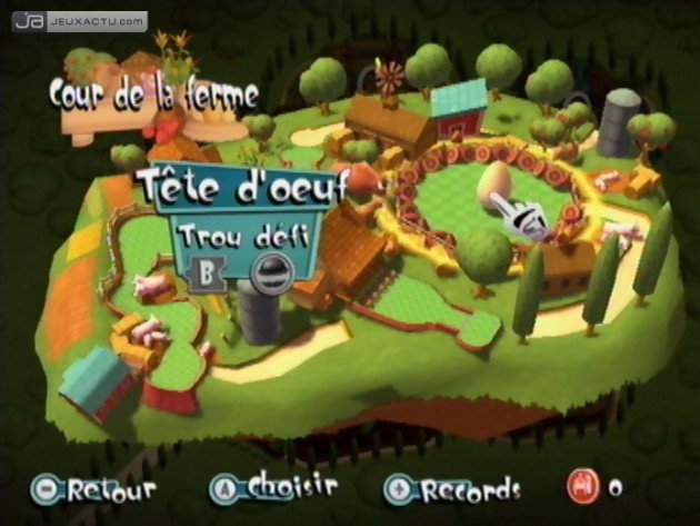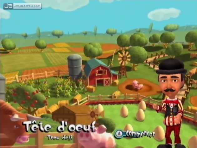 Le background a peut-être changé mais Barker, le moustachu au chapeau melon mais sans les bottes de cuir, est toujours là. Aussi à l’aise la tête en bas dans un rollercoaster que les pieds joints face à une balle de golf, ce personnage iconoclaste nous propose donc de prendre du bon temps sur des parcours de mini-golf, aussi inventifs que farfelus. Après avoir choisi et personnalisé son golfeur (parmi une liste très restreinte et un choix vestimentaire aussi limité), nous voilà propulsé dans un monde complètement burlesque où chaque environnement correspond à un thème bien précis. "Fairytella", "Paradis des Pirates", "Amazone", "Far West", "Histoires de fantômes", "Préhistoire", "la cour de la ferme" et d’autres encore, chacun de ces parcours est lié à un niveau de difficulté distinct. De même, chacun de ces mondes sont composés de différents parcours aux tracés plus farfelus les uns les autres. Car dans Carnival Games : Mini-Golf, il ne suffira pas de parfaire son swing et son toucher de balle, il va falloir aussi prendre en compte les obstacles parsemés sur le chemin. Plan d’eau, mare de lave, coquilles d’œuf, cochons souffleurs, on trouve aussi des raccourcis qui mène directement au trou, des items bonus et malus qui permettront soit de gagner des sous, soit d’en perdre. Au niveau de sensations, rien d’extraordinaire. Comme tout jeu de golf qui se respecte, Carnival Games : Mini-Golf nous demande simuler la position du golfeur en maintenant la Wiimote à deux mains pour jauger sa frappe. Pour ce faire, il suffit de maintenir le bouton A et d’exercer un geste vers l’arrière pour donner un impulsion à sa frappe, juste avant de la relâcher. On ne vous surprendra pas si on vous dit que le résultat à l’écran reste assez approximatif, même s’il est possible de déplacer son personnage et la direction de la frappe via la croix directionnelle. Puisqu’on évolue sur un mini-golf, les parcours sont forcément mini et certains d’entre eux se torchent deux-trois coups. Cela limite forcément l’intérêt et la durée de vie qui en prend un sacré coup. Comptez d’ailleurs une petite après-midi pour arriver au bout du jeu, pas plus.