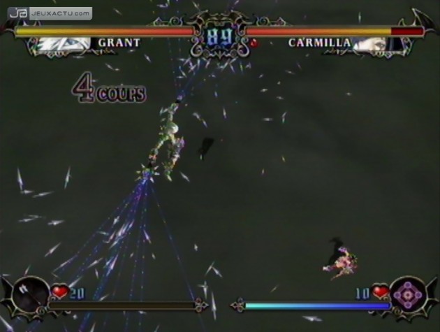 Castlevania Judgment ne fait évidemment pas le poids face aux cadors habituels du genre (Soul Calibur, Virtua Fighter, Tekken), même en mettant toute sa santé pour reprendre leurs meilleures idées. On pense notamment aux armes blanches piquées à la légende qui ne meurt jamais de Bandai Namco Games, un choix qu'on comprend aisément puisque les fouets, épées, glaives et autres lances n'ont jamais manqué dans la série. En fait, c'est la balance des coups qui se révèle problématique, ce qui empêche d'obtenir des combats à peu près équilibrés. Il ne faut pas passer dix nuits blanches sur Castlevania Judgment pour se rendre compte que Death, aussi féroce au corps à corps qu'à distance, fait partie des personnages crackés du jeu ; au même titre qu'Eric Lecarde qui est capable de claquer des combos nucléaires. De quoi écoeurer ceux qui cherchent désespérément la faille dans le jeu adverse. S'il est toujours jubilatoire de morfler pendant cette phase d'apprentissage où l'on apprend à connaître les forces et les faiblesses de chacun des combattants, pour mieux les punir après, force est de constater que Castlevania Judgment n'offre aucune marge de progression. Du coup, les combats tournent rapidement au règlement de compte entre Lecarde et Death, les autres acteurs du casting étant priés d'aller s'amuser dans le bac à sable. On pourra toujours gratter un match ou deux avec Sypha Belnades, mais enchaîner les défaites sans avoir la possibilité de se rebeller vient à bout de tout, même d'une volonté de fer. La prise en main de Castlevania Judgment avec la Wiimote et le Nunchuk n'arrange pas vraiment les choses, et démontre encore une fois qu'il ne faut pas compter sur une précision extrême de la part des deux appendices de la console lorsqu'elles ne sont pas domptées par Nintendo. Secouer la télécommande d'un mouvement sec permet de sortir une attaque classique, alors qu'il faudra insister sur le mouvement pour exécuter un combo. Avec un tel système, inutile d'espérer varier ses coups puisque la reconnaissance de mouvements ne prend pas en compte l'angle et la vitesse du geste. On se retrouve dès lors avec un rythme monotone et des attaques archi-prévisibles. Le cocktail parfait pour ruiner un jeu de combat.