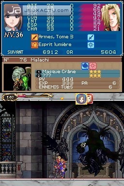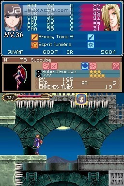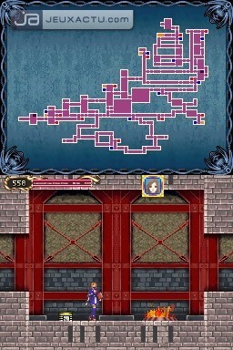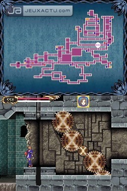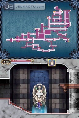 Si Konami s'est misérablement planté sur le switch, il a par contre su développer parfaitement cet aspect RPG que Castlevania : Symphony of the Night fut le premier à soumettre à la saga. On se retrouve donc avec des persos dont le level augmente en multipliant les combats, et qui peuvent s'équiper de différents éléments afin d'améliorer leurs caractéristiques. Puissance, défense, intelligence, attaque, on a droit aux critères traditionnels d'un RPG, sans oublier le statut qui renvoit à l'état de forme du personnage. Doté chacun d'une attaque de base via Y, ils peuvent aussi faire appel à une attaque secondaire préalablement configurée. Portrait of Ruin propose une bonne dose d'action avec des monstres aux attaques redoutables, c'est vrai, mais il incite également à l'exploration des niveaux pour dénicher tous les bonus et items qu'il regorge. Il arrive donc que l'on revienne dans un stage déjà exploré, en jetant régulièrement un coup d'oeil sur la map pour être certain de ne pas rater une pièce. Les niveaux ne sont pas particulièrement vastes, mais la multiplication des petites salles rend parfois l'exploration redondante. C'est pour éviter au maximum ces allers-retours soporifiques que des points de téléportation ont été mis à la disposition du joueur. Une fois le personnage placé dessus, il suffit d'appuyer en haut de la croix pour sélectionner ensuite un autre point de téléportation qui figure sur la map. Ils sont désignés par un carré bleu, et jouxtent généralement les points de sauvegarde. Ces derniers permettent d'ailleurs de blinder sa barre de PV si elle est dans le rouge, un bon moyen de ne pas gratter sur les items régénérateurs que l'on a dans sa besace. Car même si Portrait of Ruin n'est pas aussi sévère que Castlevania sur NES, il ne permet pas pour autant d'acheter une quarantaine de potions au marchand. Le stock se limite à une dizaine d'unités par produit, et il faut donc se mettre à la recherche de millefeuilles et autres crèmes glacées pour bénéficier de bonus supplémentaires.