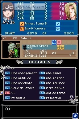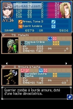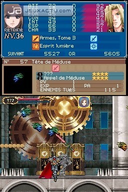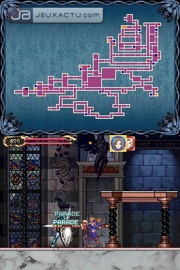 Si Konami s'est misérablement planté sur le switch, il a par contre su développer parfaitement cet aspect RPG que Castlevania : Symphony of the Night fut le premier à soumettre à la saga. On se retrouve donc avec des persos dont le level augmente en multipliant les combats, et qui peuvent s'équiper de différents éléments afin d'améliorer leurs caractéristiques. Puissance, défense, intelligence, attaque, on a droit aux critères traditionnels d'un RPG, sans oublier le statut qui renvoit à l'état de forme du personnage. Doté chacun d'une attaque de base via Y, ils peuvent aussi faire appel à une attaque secondaire préalablement configurée. Portrait of Ruin propose une bonne dose d'action avec des monstres aux attaques redoutables, c'est vrai, mais il incite également à l'exploration des niveaux pour dénicher tous les bonus et items qu'il regorge. Il arrive donc que l'on revienne dans un stage déjà exploré, en jetant régulièrement un coup d'oeil sur la map pour être certain de ne pas rater une pièce. Les niveaux ne sont pas particulièrement vastes, mais la multiplication des petites salles rend parfois l'exploration redondante. C'est pour éviter au maximum ces allers-retours soporifiques que des points de téléportation ont été mis à la disposition du joueur. Une fois le personnage placé dessus, il suffit d'appuyer en haut de la croix pour sélectionner ensuite un autre point de téléportation qui figure sur la map. Ils sont désignés par un carré bleu, et jouxtent généralement les points de sauvegarde. Ces derniers permettent d'ailleurs de blinder sa barre de PV si elle est dans le rouge, un bon moyen de ne pas gratter sur les items régénérateurs que l'on a dans sa besace. Car même si Portrait of Ruin n'est pas aussi sévère que Castlevania sur NES, il ne permet pas pour autant d'acheter une quarantaine de potions au marchand. Le stock se limite à une dizaine d'unités par produit, et il faut donc se mettre à la recherche de millefeuilles et autres crèmes glacées pour bénéficier de bonus supplémentaires.