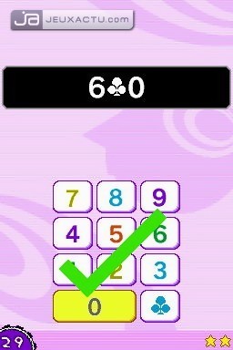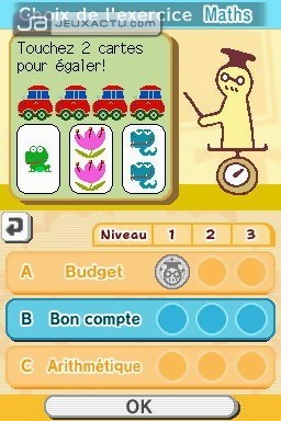 Pour les matheux, Cérébrale Académie dispose de trois épreuves de calcul. La première consiste à déterminer quelle zone de jeu possède le montant de pièces le plus important. La deuxième vous sollicitera pour toucher plusieurs cartes afin que leur somme soit égale au total d’items affichés sur le double écran. La dernière épreuve, à la manière du Programme d'Entraînement Cérébral du Dr. Kawashima : Quel âge a votre cerveau ?, se présente comme un calcul mental à ceci près qu’ici tout est écrit en lettres et que dans certains cas, au lieu de chercher le résultat, vous devrez trouver le dénominateur. Voilà qui rappellera des souvenirs ! On termine ce tour d’horizon des entraînements de Cérébrale Académie avec l’identification. Le plus simple des défis est sans conteste les Doubles où vous devez retrouver les paires parmi la foultitude d’objets affichés. L’exercice se complique un peu avec les ombres où il vous suffit de toucher l’animal, le véhicule ou le personnage masqué. Bien évidemment, les formes se meuvent plus ou moins rapidement et parfois forment un amas incompréhensible.