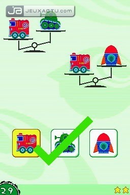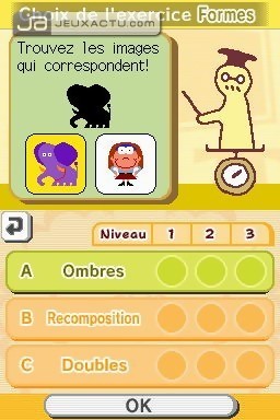 Les entraînements proposés dans Cérébrale Académie se divisent en 5 catégories faisant appel à la logique, la mémorisation, l’analyse, le calcul mental et l’identification. Et pour chaque groupe, 3 épreuves et 3 niveaux de difficulté (Easy, Normal et Hard) vous attendent. Mais commençons par un premier groupe : la logique. En premier lieu, vous devez distinguer quel objet ou quel animal est le plus lourd sur une balance. Bien évidemment, l’exercice n’est pas des plus compliqués puisqu’il suffit de remarquer quelle icône fait pencher la balance. Mais la tâche se complique dès lors que deux voire trois bascules font leur apparition et lorsque que les items proposés sont différents d’une balance à une autre. Autant dire que comparer à Brain Training, chaque essai est différent du précédent et que les habitudes de jeu ne régissent pas le résultat mais que c’est bel et bien votre esprit de déduction qui fait le boulot. Il en est de même avec l’épreuve où il faut tracer des lignes entre chaque colonne pour faire correspondre les animaux, ou encore celle qui vous oblige à déplacer un chien vers son os sur un damier en respectant les directions affichées sur l’écran supérieur. Un bon point donc que marque Cérébrale Académie face à son "concurrent" direct.