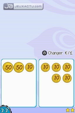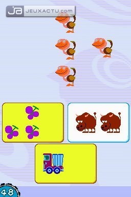 Pour les matheux, Cérébrale Académie dispose de trois épreuves de calcul. La première consiste à déterminer quelle zone de jeu possède le montant de pièces le plus important. La deuxième vous sollicitera pour toucher plusieurs cartes afin que leur somme soit égale au total d’items affichés sur le double écran. La dernière épreuve, à la manière du Programme d'Entraînement Cérébral du Dr. Kawashima : Quel âge a votre cerveau ?, se présente comme un calcul mental à ceci près qu’ici tout est écrit en lettres et que dans certains cas, au lieu de chercher le résultat, vous devrez trouver le dénominateur. Voilà qui rappellera des souvenirs ! On termine ce tour d’horizon des entraînements de Cérébrale Académie avec l’identification. Le plus simple des défis est sans conteste les Doubles où vous devez retrouver les paires parmi la foultitude d’objets affichés. L’exercice se complique un peu avec les ombres où il vous suffit de toucher l’animal, le véhicule ou le personnage masqué. Bien évidemment, les formes se meuvent plus ou moins rapidement et parfois forment un amas incompréhensible.