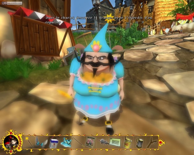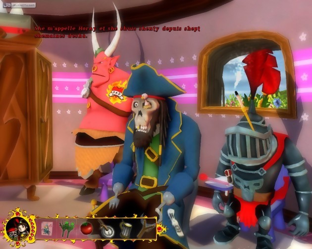 Ceville privilégie donc la qualité à la quantité. Cela se traduit notamment par la présence de différents personnages à contrôler. L'incontournable Ceville bien sûr, mais également une fillette prénommée Lilly, ainsi qu'Ambrosius, un paladin totalement imbu de sa personne. Selon les circonstances, on dirige un seul de ces héros ou plusieurs simultanément. Ils partagent alors un inventaire commun, se déplacent ensemble, et enrichissent chacun à leur manière les QCM de dialogues. Signalons au passage que certaines énigmes doivent être résolues par la simple discussion, ce qui est toujours plaisant. Enfin, il arrive même que les persos se retrouvent séparés et qu'il faille les contrôler en parallèle. Dans ce dernier cas, il faut mettre à profit la possibilité de zapper à loisir de l'un à l'autre pour venir à bout de certaines énigmes. Cette multiplicité de points de vue est facilitée par la réalisation graphique entièrement en 3D, chose qui n'est bizarrement pas encore devenue la norme dans le domaine spécifique du point & click. Les graphismes cartoon aux couleurs vives collent parfaitement à l'ambiance délirante, et on s'accommode facilement des quelques limitations techniques (peu de polygones pour que le jeu tourne sur des PC modestes, des textures parfois baveuses) et autres choix discutables (effet de flou trop prononcé, certains angles de caméra). En revanche, l'aspect sonore est quasiment irréprochable puisque l'éditeur a eu le bon goût de privilégier une version originale sous-titrée plutôt qu'une version française intégrale. On peut ainsi se délecter du délicieux accent british de la plupart des personnages, ainsi que des expressions "en français dans le texte" du cuisinier royal frenchie. Pour être vraiment précis, on devrait même parler de sur-titres plutôt que de sous-titres puisqu'en dehors des QCM, les lignes de dialogue s'affichent au dessus des personnages qui les prononcent. Comme dans Monkey Island, oui. Ce système est avantageux à double titre : on comprend instantanément qui parle, et le regard reste concentré en permanence sur l'action. Le seul inconvénient provient des rares fois où un personnage secondaire s'exprime spontanément hors-champ et voit donc son sur-titre partiellement coupé. Rien qui ne puisse justifier le fait que les sous-titres "bas" soient devenus la norme ailleurs. De même, Ceville se démarque de la plupart des autres jeux d'aventure en proposant une fonction de sauvegarde automatique. Bien pratique si le PC se met à planter ou qu'on décide après-coup de revivre un moment précis. Et vous l'aurez compris, des bons moments, Ceville n'en manque pas.