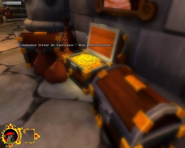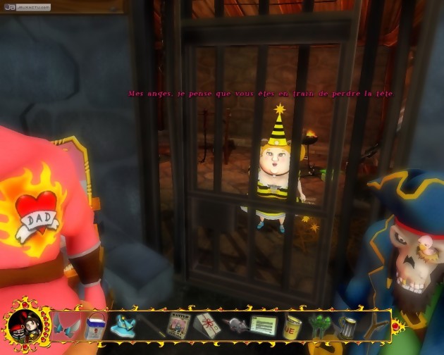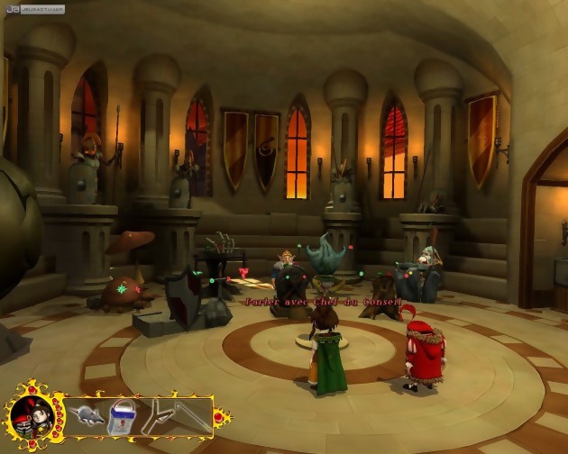 Ceville privilégie donc la qualité à la quantité. Cela se traduit notamment par la présence de différents personnages à contrôler. L'incontournable Ceville bien sûr, mais également une fillette prénommée Lilly, ainsi qu'Ambrosius, un paladin totalement imbu de sa personne. Selon les circonstances, on dirige un seul de ces héros ou plusieurs simultanément. Ils partagent alors un inventaire commun, se déplacent ensemble, et enrichissent chacun à leur manière les QCM de dialogues. Signalons au passage que certaines énigmes doivent être résolues par la simple discussion, ce qui est toujours plaisant. Enfin, il arrive même que les persos se retrouvent séparés et qu'il faille les contrôler en parallèle. Dans ce dernier cas, il faut mettre à profit la possibilité de zapper à loisir de l'un à l'autre pour venir à bout de certaines énigmes. Cette multiplicité de points de vue est facilitée par la réalisation graphique entièrement en 3D, chose qui n'est bizarrement pas encore devenue la norme dans le domaine spécifique du point & click. Les graphismes cartoon aux couleurs vives collent parfaitement à l'ambiance délirante, et on s'accommode facilement des quelques limitations techniques (peu de polygones pour que le jeu tourne sur des PC modestes, des textures parfois baveuses) et autres choix discutables (effet de flou trop prononcé, certains angles de caméra). En revanche, l'aspect sonore est quasiment irréprochable puisque l'éditeur a eu le bon goût de privilégier une version originale sous-titrée plutôt qu'une version française intégrale. On peut ainsi se délecter du délicieux accent british de la plupart des personnages, ainsi que des expressions "en français dans le texte" du cuisinier royal frenchie. Pour être vraiment précis, on devrait même parler de sur-titres plutôt que de sous-titres puisqu'en dehors des QCM, les lignes de dialogue s'affichent au dessus des personnages qui les prononcent. Comme dans Monkey Island, oui. Ce système est avantageux à double titre : on comprend instantanément qui parle, et le regard reste concentré en permanence sur l'action. Le seul inconvénient provient des rares fois où un personnage secondaire s'exprime spontanément hors-champ et voit donc son sur-titre partiellement coupé. Rien qui ne puisse justifier le fait que les sous-titres "bas" soient devenus la norme ailleurs. De même, Ceville se démarque de la plupart des autres jeux d'aventure en proposant une fonction de sauvegarde automatique. Bien pratique si le PC se met à planter ou qu'on décide après-coup de revivre un moment précis. Et vous l'aurez compris, des bons moments, Ceville n'en manque pas.